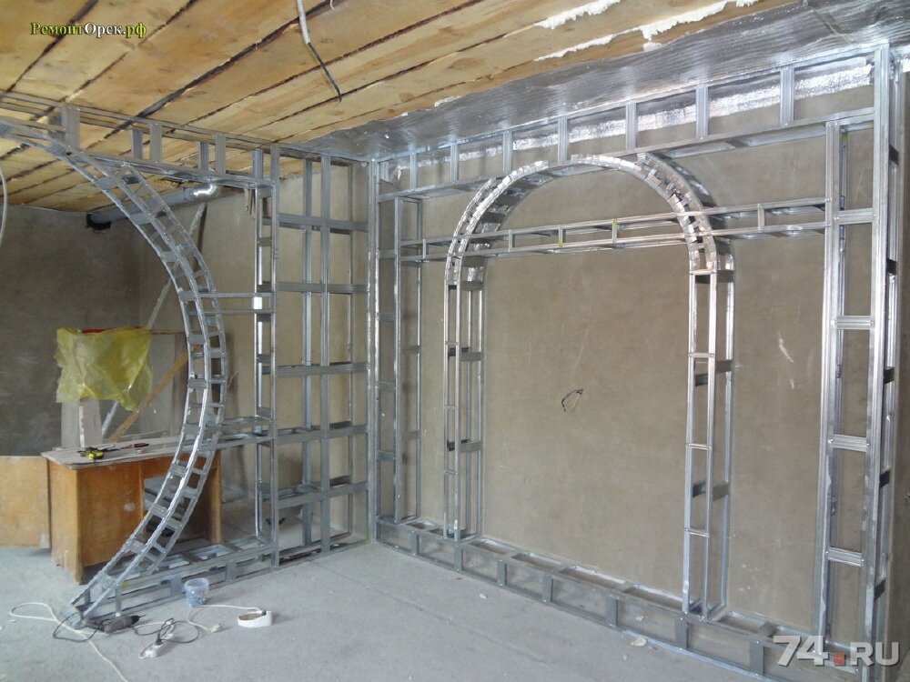 Теперь нам понадобится гидравлический или лазерный уровень – с их помощью мы и определим необходимую длину наших опорных профилей. Делаем соответствующие отметки на них и с помощью болгарки или ножниц укорачиваем профили до необходимой длины.Осталось уже совсем немного – добавить дополнительные стойки по внутреннему и наружному радиусу и обшить бока гипсокартоном. С дополнительными стойками, думаю, сами разберетесь, установить их нужно хотя бы через каждые 200мм, а вот с гипсом дело обстоит немного сложнее.