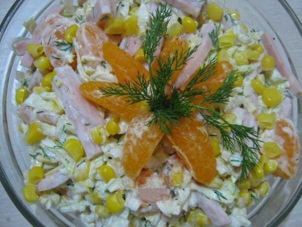 Еще с самого детства у меня одной из ассоциацией с Новым годом был запах и вкус мандаринов. Думаю, что вы со мной согласитесь! Мандарины всегда занимают почетное место на нашем новогоднем столе. Но рано или поздно, это приедается и тогда приходит на ум такое.... что даже сами мандарины в шоке от этого! Итак, предлагаю вашему вниманию обалденный вкусный новогодний салат "Мандарин в шоке" Для него нам понадобится: Не правда ли интересная компания для нашего мандарина? Начнем приготовление нашего салата. Возьмем глубокий салатник. В него мы нарежем небольшой соломкой пекинскую капусту. Не забываем перед этом ее промыть водой. Далее перейдем к ветчине, ее очистим от кожуры и так же нарежем ее соломкой. Следующим будет у нас сыр. Его мы натрем на крупной терке. Лучше всего брать сыры твердых сортов, их удобнее натирать. А теперь наконец-то наши мандарины. Их мы помоем, очистим от кожуры и белых прослоек. Разделим наши мандарины на дольки. Теперь каждую дольку поделим на две части. Если ж