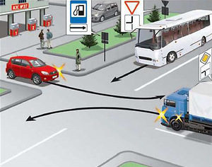 Водитель автобуса намерен проехать перекресток прямо, водитель грузовика хочет повернуть налево, а водитель легкового автомобиля выезжает с заправки налево. Вопрос. В какой последовательности транспортные средства проедут перекресток? [Ответ в конце статьи] Теория п 13.9 ПДД. На перекрестке неравнозначных дорог водитель транспортного средства, движущегося по второстепенной дороге, должен уступить дорогу транспортным средствам, приближающимся по главной, независимо от направления их дальнейшего движения. п 8.3 ПДД. При выезде на дорогу с прилегающей территории водитель должен уступить дорогу транспортным средствам и пешеходам, движущимся по ней, а при съезде с дороги - пешеходам и велосипедистам, путь движения которых он пересекает. Ответ. Водитель легкового автомобиля выезжает с прилегающей территории (АЗС), поэтому должен уступить дорогу автобусу и грузовику (пункт 8.3 правил дорожного движения). Водитель грузовика находится на главной дороге, поэтому у него приоритет (пункт 13.9 пра