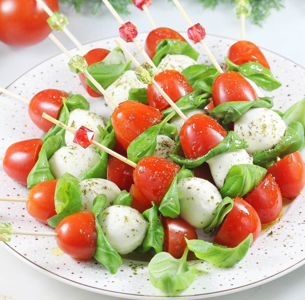 Канапе Капрезе - мои любимые. Они просты в приготовлении, красиво оформлены и имеют прекрасную цветовую комбинацию. Чтобы сделать их, просто вымойте все помидоры и листья базилика. Помидоры разрезать пополам. Наденьте половинку помидора на шпажку. Затем сложите лист базилика пополам и неденьте его.После маленький шарик из моцареллы с маринованным огурцом и повторите все а в обратном порядке. Лист базелика и половина помидора.