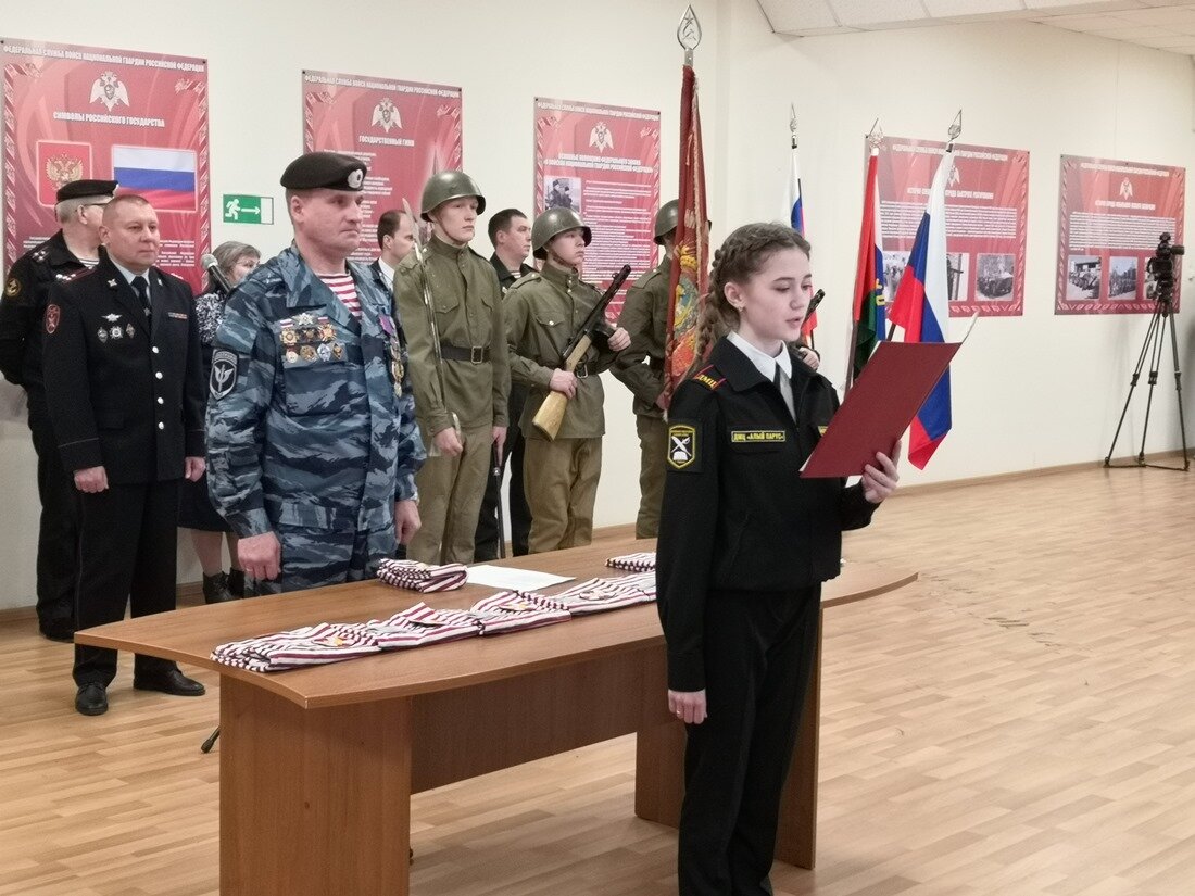 В Управление Росгвардии по Тюменской области состоялось торжественная церемония посвящения 30 юношей и девушек от 14 до 16 лет в кадеты Росгвардии. Мероприятие провели в день празднования 250-летия со дня рождения генерала от инфантерии Е.Ф. Комаровского. Воспитанники Детского морского центра «Алый парус» - ученики гимназии № 16 города Тюмени перед Боевым знаменем 393 отдельного зенитно-артиллерийского дивизиона дали торжественное обещание кадета Росгвардии: «Самоотверженно служить своему Отечеству, быть честным и верным товарищем…», - прозвучало из уст будущих защитников Родины, которые вступили в состав специализированной профильной группы Росгвардии «Монолит». В знак принятия обещания они получили из рук боевых офицеров ОМОН краповую тельняшку, шеврон Росгвардии и удостоверение кадета. С этим знаменательным событием ребят поздравили начальник Управления Росгвардии по Тюменской области полковник полиции Евгений Симаков, председатель Комитета молодёжной политики Департамента по спор
