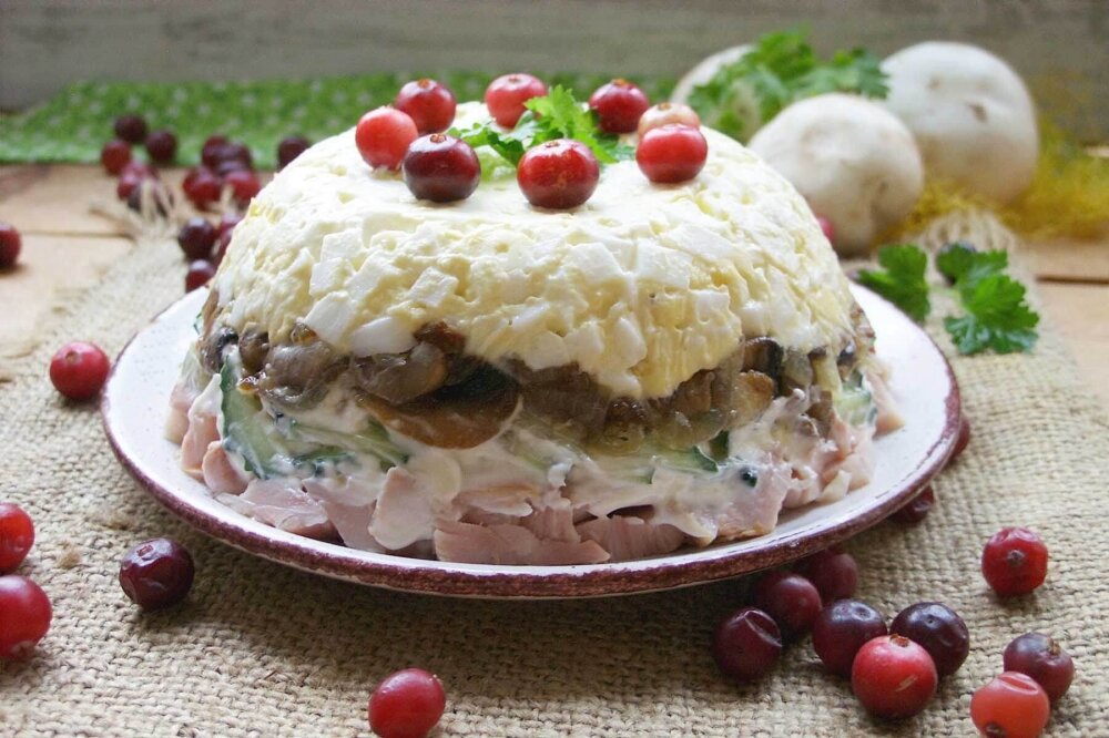 Салат с копченой курицей и грибами (Салат "Ирина")