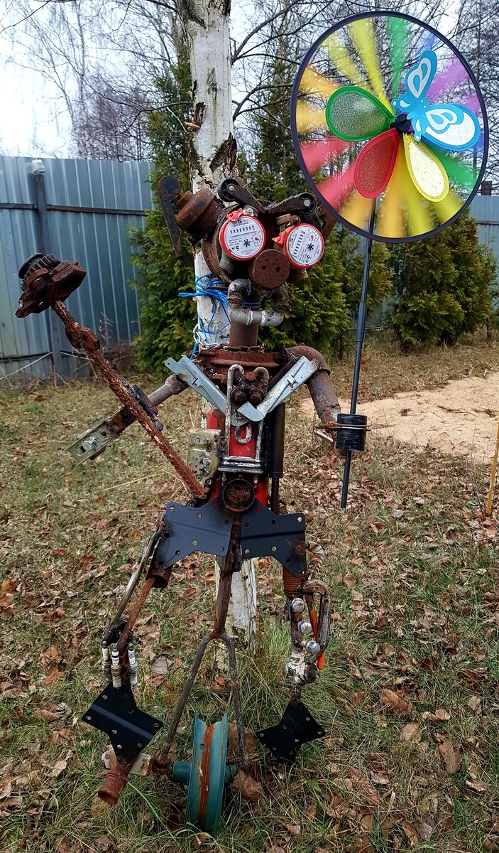 Продолжая тему расхламления дачи , начало этой истории вот здесь (тут мы делали детскую площадку из завалявшевсегося хлама на даче ). Поделюсь еще идеей , куда можн о применить то, что и выбросить жалко , и хранить не хочется Включаем фантазию и сварочный аппарат. Да , эта работа для мужчин конечно же . Но мы - девушки будем идейными вдохновителями и покажем своим мужчинам эту статью , они будут рады повозиться в своем гараже с железками . Помните ,как в детсве собирали конструктор ? Вот точно так же !берем и делаем ! Делаем Чудика (Настя почему то его Диксиком назвала ). При близком рассмотрении видим всякий хлам , который нигде не применить. Машинные перегаревшие свечи Использованный огнетушитель Сломанные водосчетчики Нагревательная часть от стиральной машинки Ржавые пружины Ржавые переходники для труб Ржавые гайки Ушки - запчасть от огнетушителя Закрепили его к берёзе очень надежно (цепями и веревками) что бы не упал на детей . Говорят , что расхламление всегда приводи