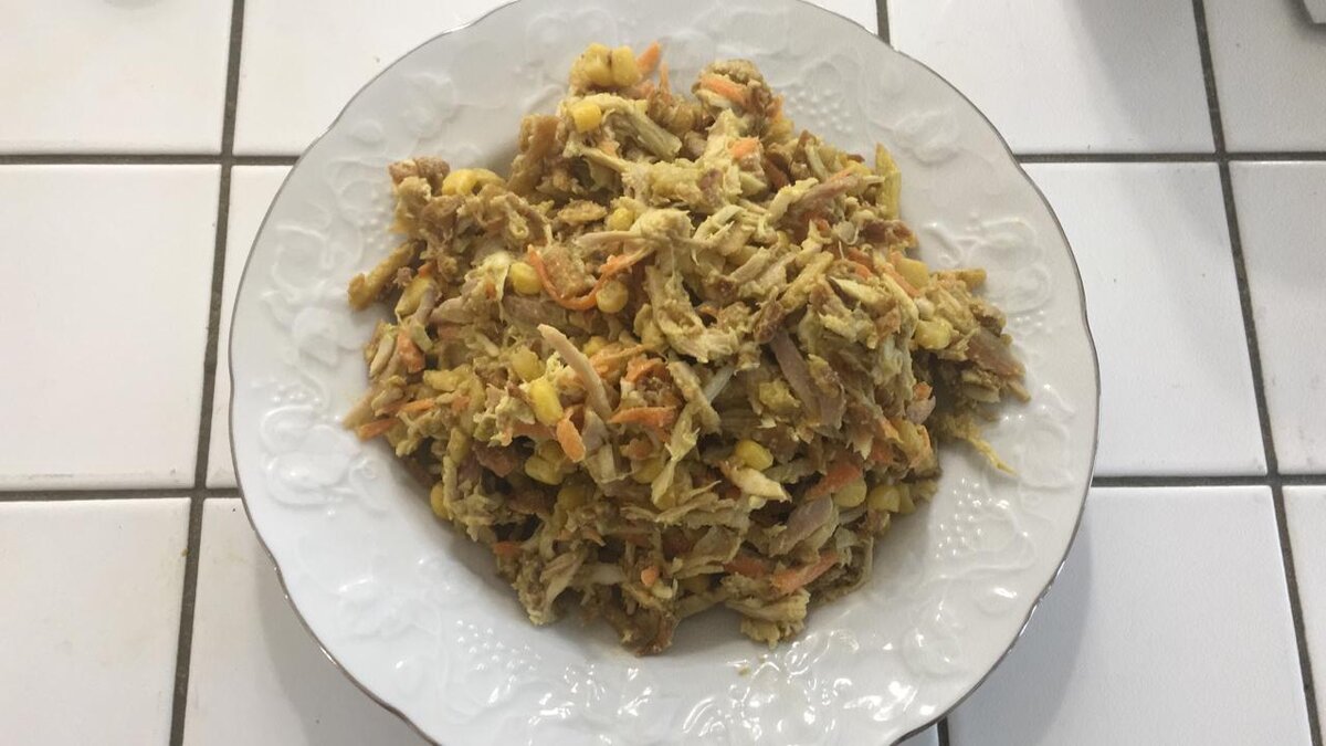 Курицу гриль разобрали на волокна, пожарили тоненькой соломкой картошку, добавили кукурузу из банки, сырую морковку на крупной терке, хрустящий жареный лук и консервированный халапеньо (можно заменить любым маринованным острым перцем).