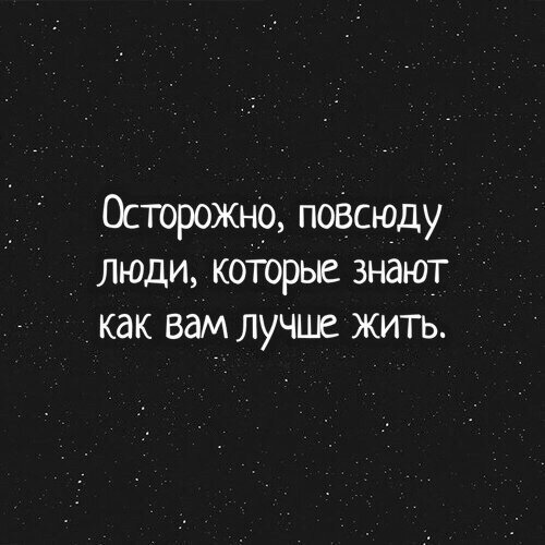 Почему люди считают, что лучше знают, как мне жить мою собственную жизнь? Это выводит из себя безумно. Мне вбивают в голову мысли о том, что я выйду замуж, ОБЯЗАТЕЛЬНО рожу детей и буду счастлива. Без этих пунктов счастья нет. А когда я говорю, что, возможно, не захочу всего этого и буду жить одна, мне говорят, что захочу, ВЕДЬ ВСЕ ХОТЯТ. Как же некоторые люди не понимают, что не для всех счастье заключается в замужестве/женитьбе и детях. Есть люди, которые хотят жить только для себя. Я ничего не имею против людей, для которых счастье в семье. Это их выбор и их жизнь. Они лучше знают, что для них хорошо и как им лучше прожить жизнь. И я уважаю выбор этих людей, но хочу, чтоб так же уважали и мой выбор, а не говорили: "Ты обязательно захочешь замуж и детей. Чтоб всё было как у всех." Уважайте друг друга и мир станет чуточку лучше.