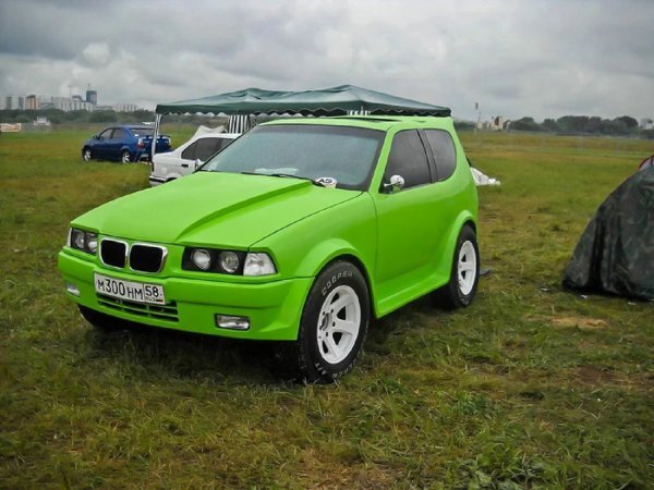 Эту «БМВ-Ниву» можно назвать примером качественного «колхоза». Ранее среди автолюбителей был известен фестиваль «Автоэкзотика», где владельцы хвастались самодельными автомобилями — как качественными «переделками», так и откровенным «колхозом». Об этом рассказал на одном из форумов сети пользователь, которого привлек чрезвычайно любопытный экспонат фестиваля ярко-зеленого цвета. Это ВАЗ-2121, скрещенный с «мордой» от BMW и значительно переделанный по кузову — настолько, что «Нива» в нем и не сразу узнается. Как рассказывает автор, за свою «переделку» владелец эдакого гибрида даже получил главный приз в номинации «Кастом». А вот история у этого автомобиля довольно забавная. Изначально владелец ездил себе на ВАЗ-2121 и не тужил, но после попадания в ДТП у отечественного внедорожника пострадала передняя часть. Тогда автомобилист решил отличиться и поставил на «Ниву» оптику и решетку радиатора от BMW. А вот история у этого автомобиля довольно забавная. Изначально владелец ездил себе на ВАЗ