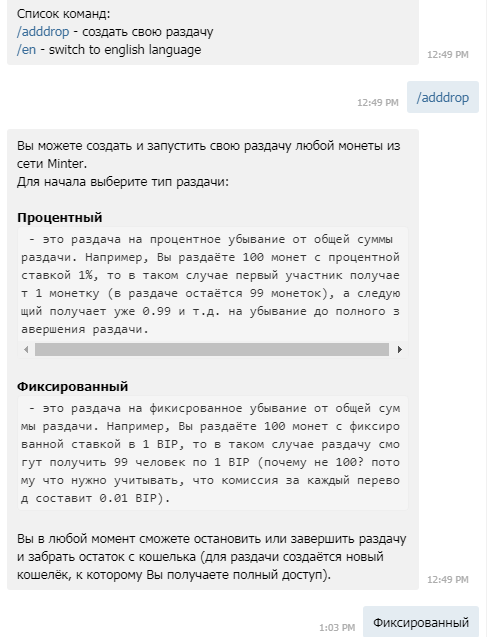 Как стимулировать интерес к себе, к своим материалам? Как поощрять аудиторию? Эти и многие другие, подобные вопросы част задаются при старте любого проекта. Меня эти вопросы тоже не обошли. Вот я и решил протестировать один любопытный сервис на площадке Минтер, называется он Bip Bonus Bot. И он позволяет создать раздачу любых монет, выпущенных внутри сети. Бот интуитивно понятен и позволяет создать раздачу буквально за несколько нажатий. Нам для начала необходимо выбрать как будут раздаваться монетки в процентном соотношении от банка или фиксированное вознаграждение, а также за что именно подписчик получит данный бонус. Тут варианта тоже два. Без всяких условий, за красивые глаза, или за подписку на канал или группу в Телеграмме. Для проверки выбрал раздачу по подписке к каналу в телеграмм. Для этого достаточно добавить бота в админы группы или канала, чтобы он мог отслеживать вступления и расплачиваться с выполнившими "задание". По факту формирования раздачи она привязывается к кон