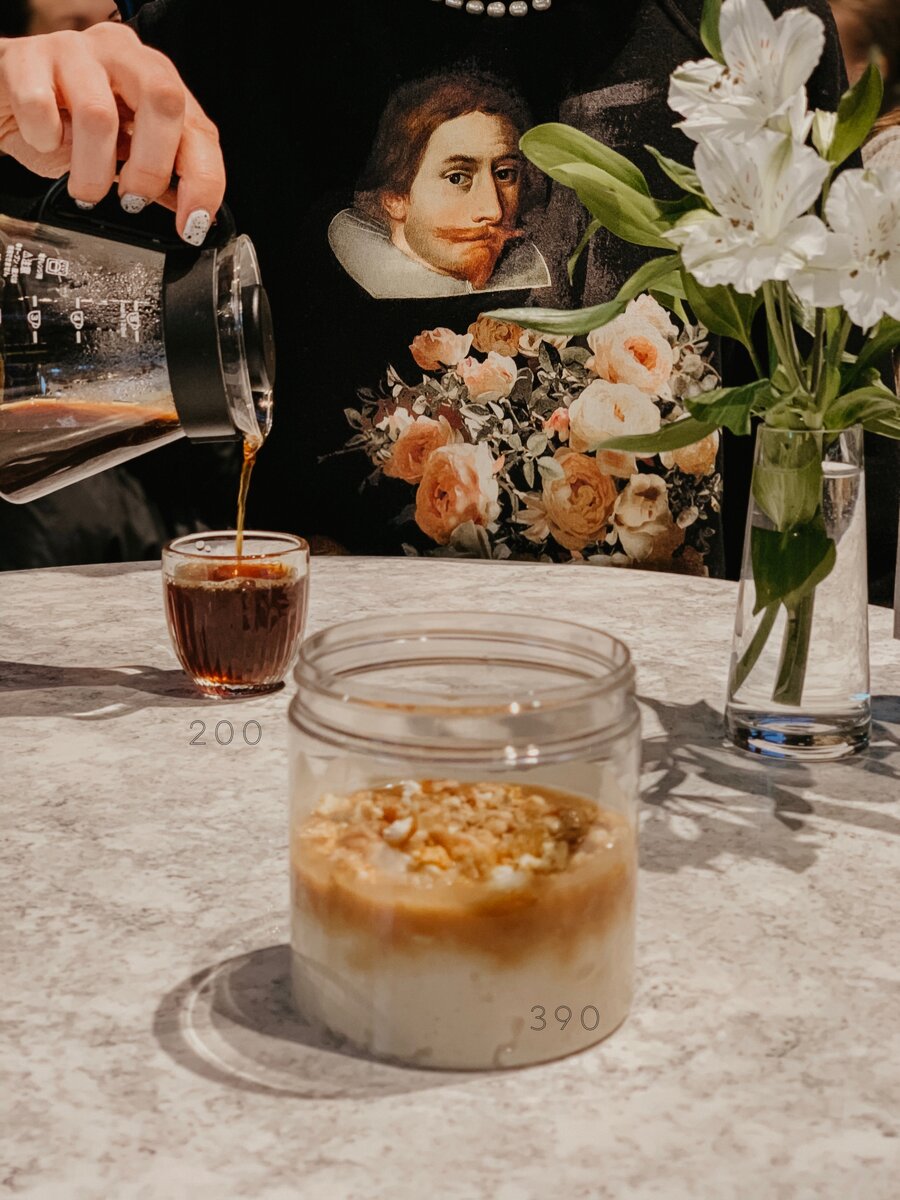 🕓 пн-чт, вс 10:00-23:00, пт-сб 10:00-2:00. Для петербуржцев расскажу, что «Депо» – это как Василеостровская рынок, только проектов тут, ну на вскидку, раз в 50 больше. Меню завтраков симпатичное, а мне вот витрина с десертами понравилась. Только бюджет мой трещал по швам. Тортики на развес я тоже отмела (двести с лишним рублей за 100 граммов), а вот рисовый пудинг на кокосовом молоке прямо из разряда хочу-немого. Банка за 390₽. Попить внезапно есть «воронка» и стоит совсем не по-московски, 200₽. Итого: 590₽. 14/15 Hello people 🏠 Лесная ул., 20, Фудмолл «Депо»
