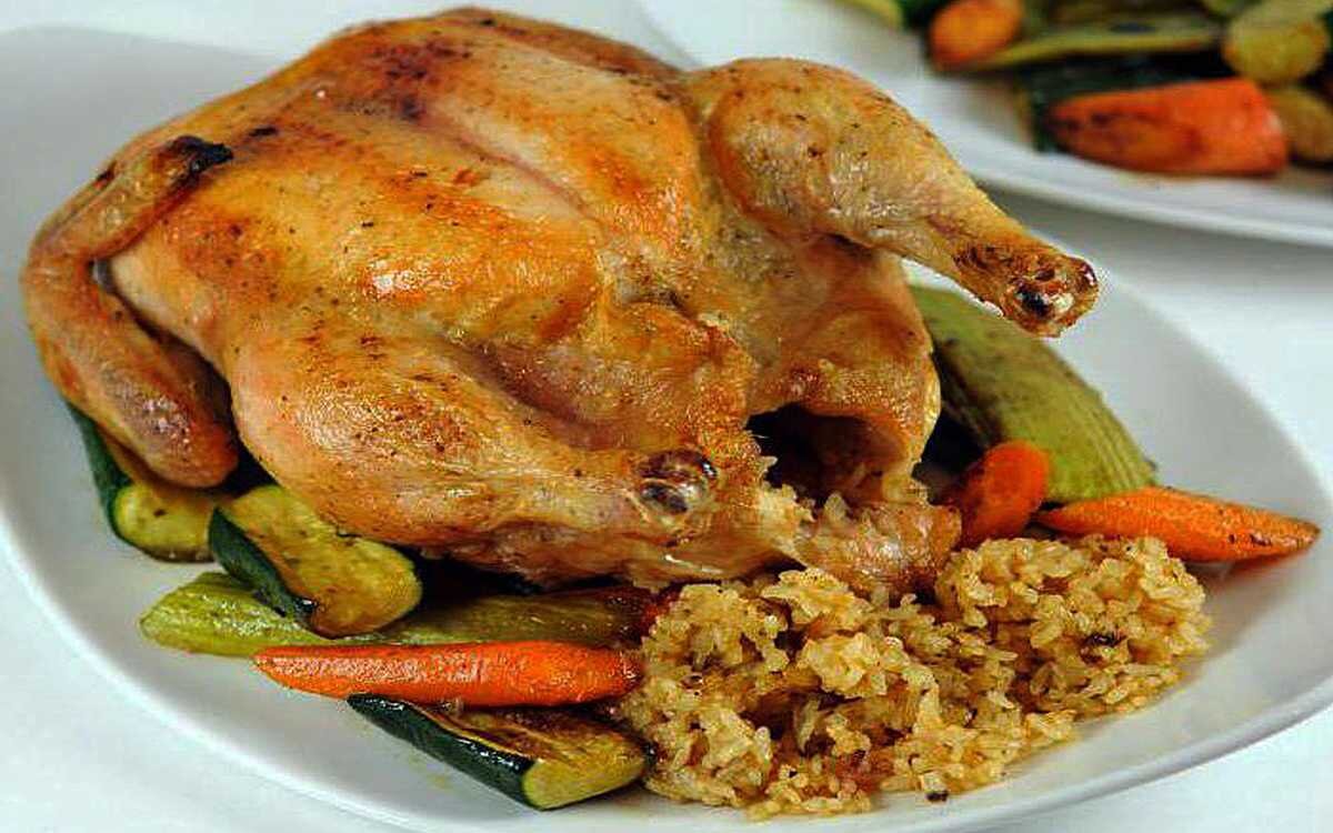 Сегодня мы приготовим курицу фаршированую рисом. Этот простой, но необычный рецепт, может стать вашим коронным блюдом! Для того, чтобы его приготовить нам нужно: - целая курица (1 шт. ) - рис (1 ст.) - морковка (1 шт.) - лук репчатый (1 шт.) - чеснок (3 зубч.) - горчица (2 ст.л.) - соль и спeции (по вкусу) Итак, приступим: Шаг 1 Рис варим около 10 минут. Шаг 2 В это время репчатый лук и морковь чистим, морковь натераем на крупной тёрке, а репчатый лук мелко нарезаем. Шаг 3 Обжариваем наши овощи и помешиваем, на протяжении минут 10-15. Шаг 4 Перемешиваем рис с морковью и луком, солим и добавляем специи. Шаг 5 Чеснок чистим и натераем на мелкой тёрке. Шаг 6 Курицу моем, сушим и обмазываем горчицей, натираем чесноком, солью и специями. Шаг 7 Фаршируем курицу рисом с овощами и зашиваем плотной ниткой или же скрепляем зубочистками. Шаг 8 Очень аккуратно перекладываеи зафаршированную курицу в форму для запекания или противень, накрываем фольгой и отправляем в духовку. Шаг 9 З