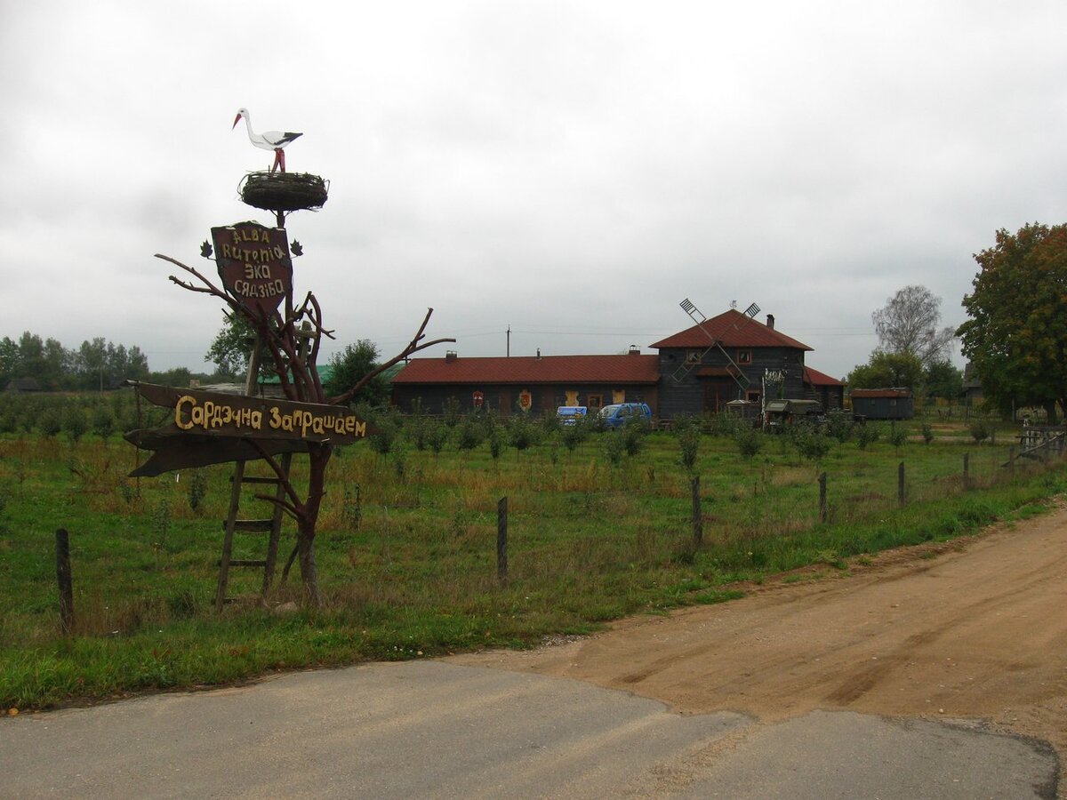 Утро выдалось пасмурным, однако дождя, преследовавшего нас почти все время, не было, что несколько радовало - несмотря на предельную близость трассы к дому моих родственников, ждать под дождем не улыбалось ни разу. И вот, получено подтверждение о том, что маршрутка вышла из Лиды, а значит, через 15 минут она уже будет напротив дома. Рядом - через дорогу - экоусадьба - популярный в Беларуси вид бизнеса и отдыха.