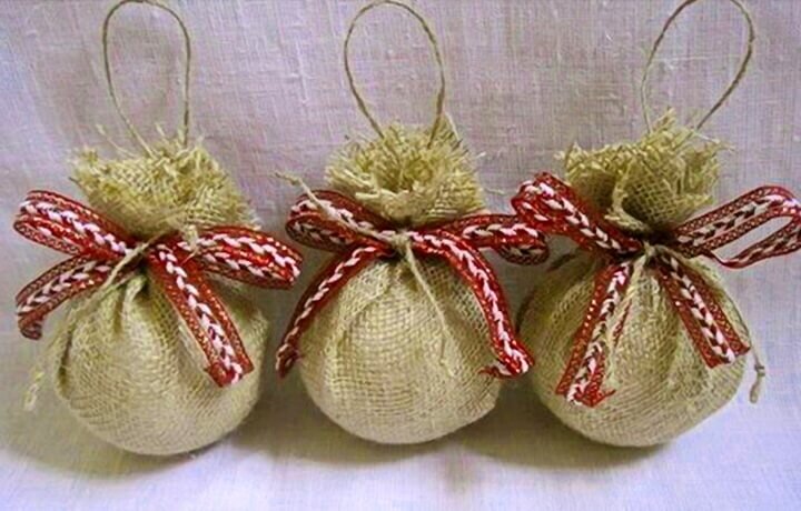 Идея понравится тем, кто любит мешковину в интерьере, минимализм, очаровательную простоту. А также тем, чьи елочные игрушки требуют обновления. Создайте дома уют с помощью простого материала всего за несколько минут.