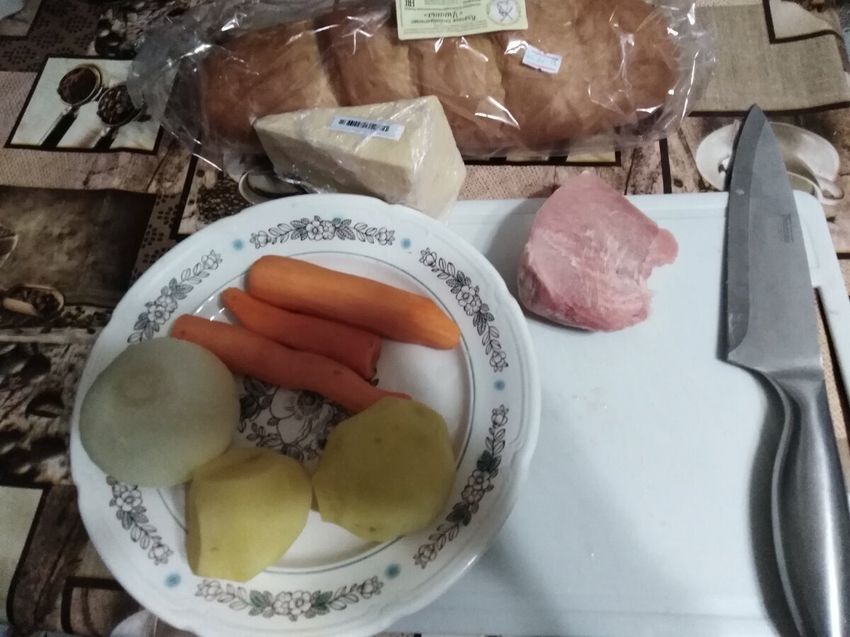 Точного рецепта не будет, используется что есть. Я использовал морковку, лук, картошку, сыр, свинину и непосредственно батон. Ну специи по вкусу.