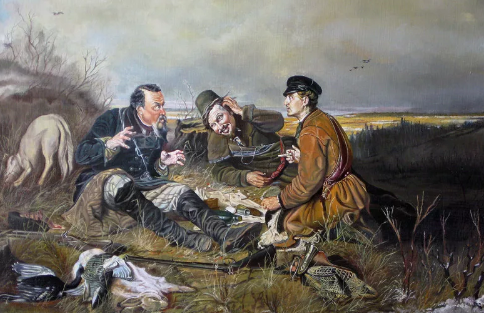 Три мужика на охоте подстрелили утку. В общем организовали они кастер и небольшой стол. Запекают они утку и разговаривают об охоте , кто лучше стреляет.