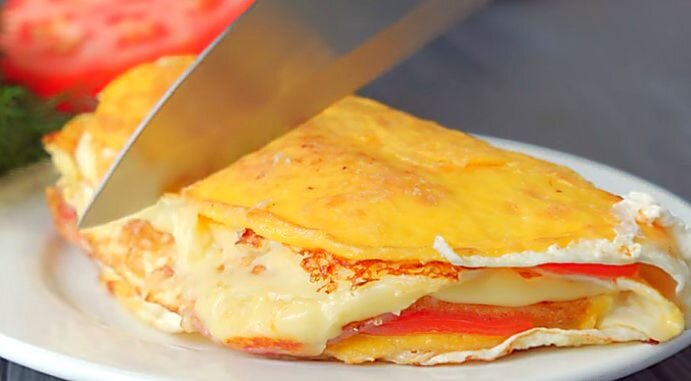 Когда белок не много схватиться, выкладываем два кусочка куриной ветчины. Накрываем ветчину второй половиной белка. С другой стороны наливаем на сковородку не много желтка, для образования второй половины. Сверху на желток ложем две тонкие дольки помидора. Переворачиваем на другую сторону. Рядом наливаем белок. Сверху на белок ложем два кусочка тонкого сыра. Накрываем наш конвертик второй стороной. Далее наливаем на сковороду желток и кладём два кусочка сыра. Перевернём опять наш конвертик на другую сторону.
