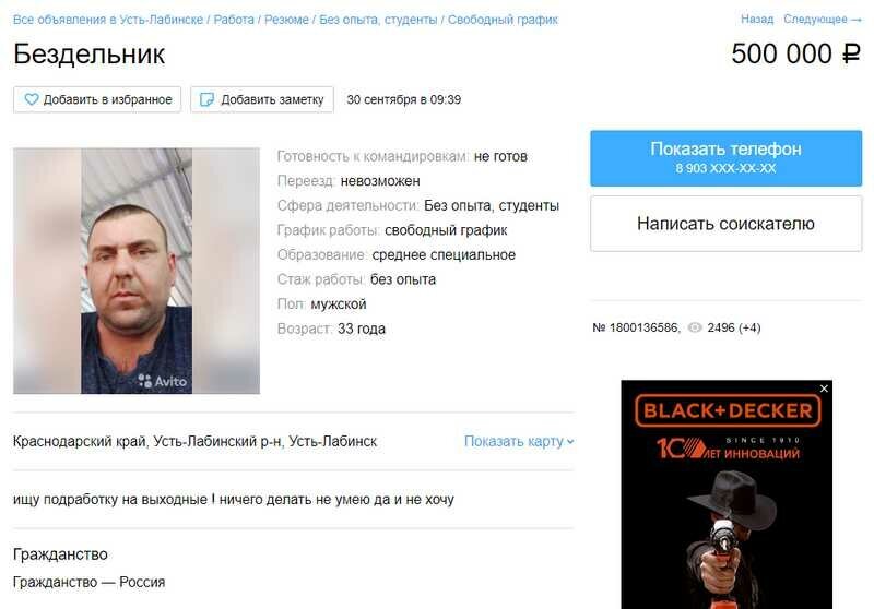 Ничего делать не умею, да и не хочу. А зарплата 500 тысяч На глаза попалась новость, в которой рассказывается, что средняя зарплата в Краснодарском крае 37 тысяч рублей. Я попытался вспомнить знакомых, у которых примерно такая же зарплата бы была, и не смог. Нет у меня таких знакомых. Есть предприниматели, у которых доход выше 50 тысяч, но речь о зарплате, а не о доходах. Поспрашивал у знакомых в Усть-Лабинске, это небольшой город в Краснодарском крае, у кого какая зарплата. Моя жена работает в государственной компании, и у неё зарплата 13 000 рублей. Знакомый учитель получает 23 тысячи в месяц, с учётом стажа больше 15 лет. Продавцы в Магните, которые работают с утра до ночи в районе 22 000 рублей. Знакомая работает медсестрой, у неё зарплата 12-15 тысяч. Подсобника на стройку, который будет впахивать 8-10 часов, можно найти за 1 000 рублей в день. Это в районе 20-25 тысяч в месяц получается. Может у меня неправильные знакомые? Полез на Авито, там можно посмотреть объявления о работ