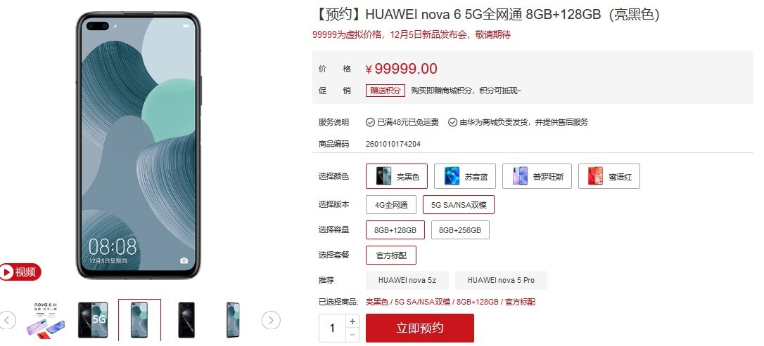 5 декабря Huawei официально представит свой новый смартфон Nova 6. Однако уже сейчас компания начала принимать предзаказы в своем китайском онлайн-магазине Vmall. Стоимость Huawei Nova 6 на сайте не указана, однако раскрыты некоторые характеристики и дизайн смартфона. Как и ожидалось, новинка получила двойную фронтальную камеру, врезанную в экран (по слухам, один из датчиков — 32-мегапиксельный), сканер отпечатков пальцев на правой грани, а также основную камеру с четырьмя датчиками. Кроме того, Huawei Nova 6 должен получить чип Kirin 990, аккумулятор на 4000–4500 мАч с быстрой зарядкой и Android 10. В магазине на выбор есть две версии смартфона: с 4G и с поддержкой 5G. Также есть две конфигурации: с 8 ГБ оперативной памяти и 128 либо 256 ГБ хранилища. Также Huawei предлагает четыре расцветки: черную, синюю, красную и сиреневую градиентную. Скорее всего, 5 декабря вместе с Huawei Nova 6 дебютирует и его упрощенная версия — Huawei Nova 6 SE.
