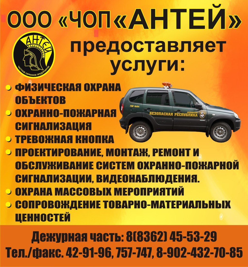 Добрый день! Давайте знакомиться. Наша компания - ООО "ЧОП"Антей" более 10 лет на рынке охранных услуг. Мы оказываем весь комплекс охранных услуг для безопасности Вашего бизнеса. Позвоните к нам, Вам помогут подобрать наиболее оптимальный вариант для решения Вашей задачи.