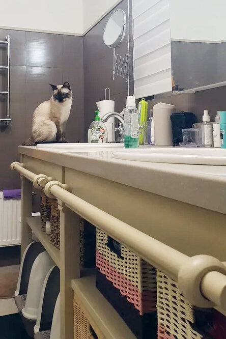 В итоге, от двоих котов удалось "избавиться", но наш нахаленок Митюша еще долго донимал меня: то зубную щётку отбирал, то закрывал от меня раковину. Но кульминацией всех его вредностей стал прыжок на меня, когда я нагнулась над раковиной. Я не ожидала, что он решит прыгнуть на сверхмалую высоту... Но он сделал это, приземлившись мне на шею и почти втопив мою морду в раковину. Помешал кран, который не позволил моей "башковитой" голове полноразмерно встретиться с дном раковины 🤪🤪