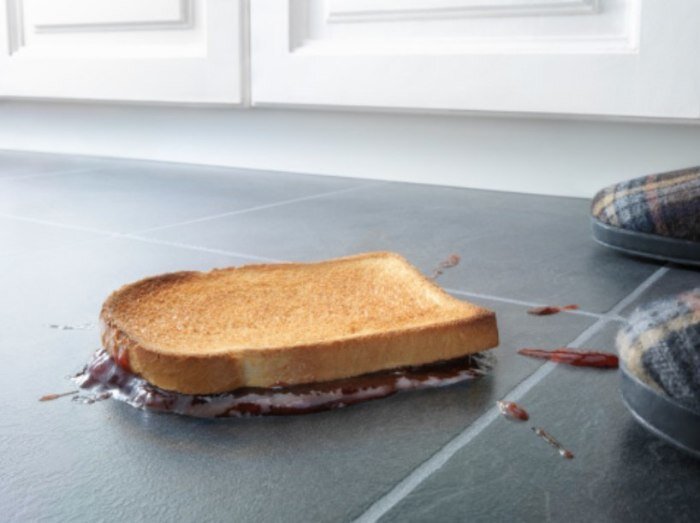 Злосчастный бутерброд с маслом всегда падает этим самым маслом вниз. Но почему именно так? Закон подлости? Не плохой, но не самый научный вариант. Давайте разбираться! Вопрос бутерброда обрёл большую популярность, изучением этого явления занимался английский физик Роберт Мэтьюс. Он провёл масштабный эксперимент в 2001 году и привлёк к нему тысячи школьников. В итоге 61% бутербродов из 9821 упали маслом вниз. За такие усилия Мэтьюс получил Шнобелевскую премию. У этого вопроса, как оказалось, есть две стороны. Результат падения зависит: Центр тяжести куска хлеба находится идеально посередине, но если намазать его маслом — центр тяжести сдвинется вверх и приведёт к известному печальному результату. Плюс, средняя высота на которой находится бутерброд когда мы его едим — 1,5 метра и при падении он просто не успевает сделать полный оборот. Роберт Мэтьюс первый рассчитал, что бутерброд должен находится на высоте 3 метров, что бы упасть на чистую сторону.