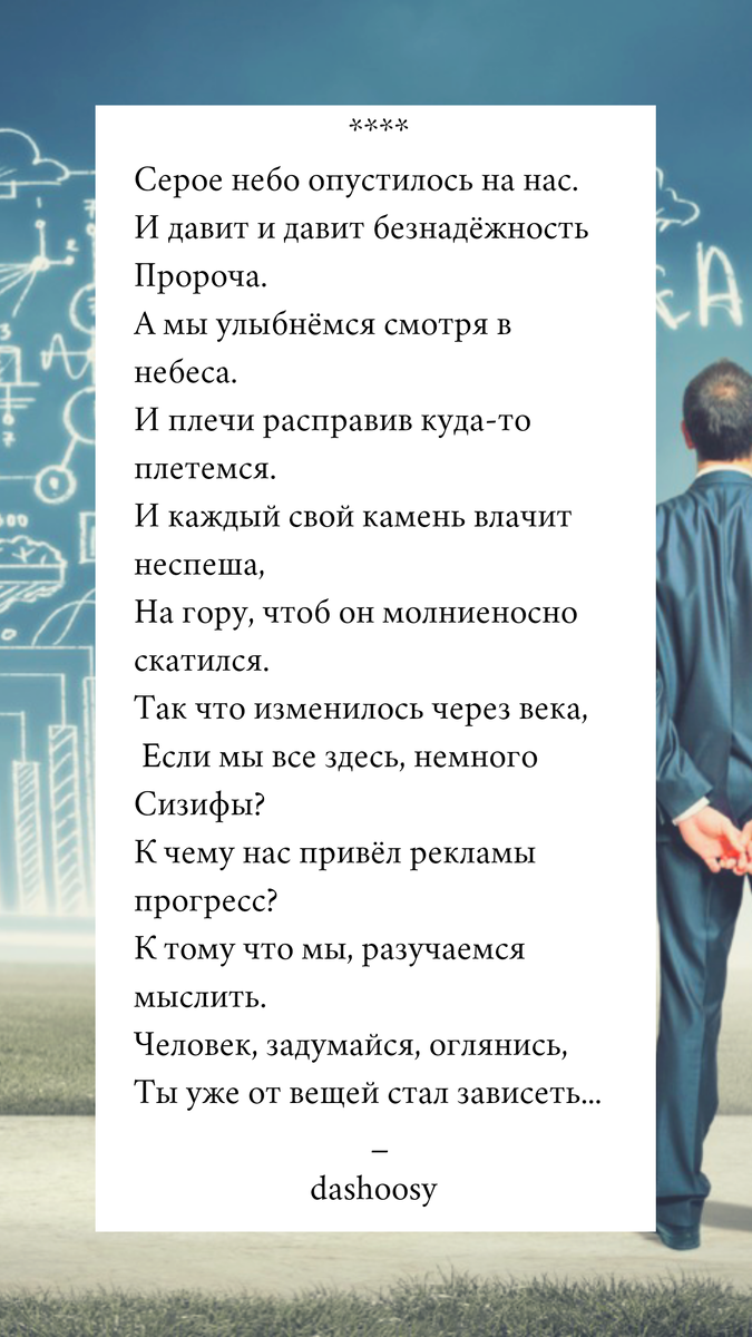 Не забываем ставить 👍 Но самое важное для меня это найти своего читателя, того, кому будет с интересом и нетерпением ждать моего нового творения, пусть даже оно не идеально и не всегда попадает в размер и рифму😜 Я готова ждать, я подожду своего читателя здесь и на своей страничке в инстаграм @dashoosy Листай до конца, там сообщение для тебя - > На такой оптимистично ноте, я хочу закончить этот пост. И подытожить, что всё будет хорошо 🙌