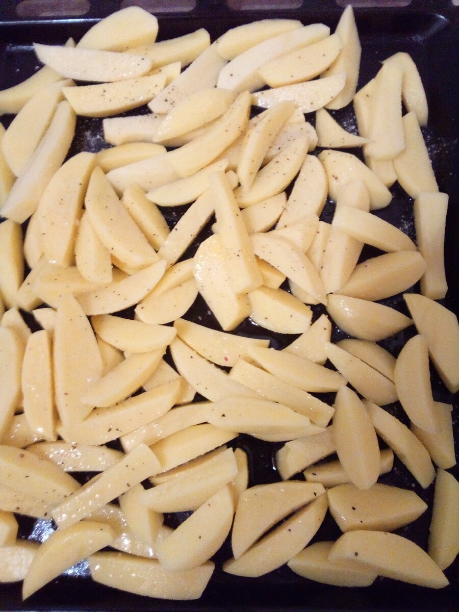 Приготовим - ка мы сегодня картошку - фри , где мало масло и не жаренную , а в духовке . Конечно не очень полезно , но иногда себе можно позволить. Приготовим с начало картофель. Промоем , почистим и нарежем на брусочки. Выкладываем все в противень , перемешиваем с солью , перцем и 2 - 3 столовых ложек растительного масла . Запекаем в духовке 40 - 45 минут , при температуре 220 градусов.