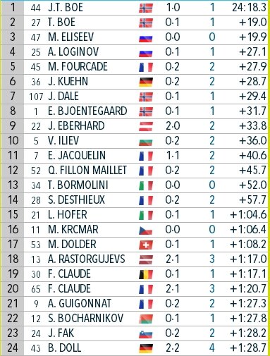 Первая медаль сборной России в нынешнем биатлонном сезоне. Матвей Елисеев после второй стрельбы уходил первым, выигрывая у двух братьев Бё 9,1 и 19,8 секунд соответственно. До финиша Елисееву не удалось додержать своё преимущество, если от младшего Бё он в итоге отстал почти на 20 секунд (19,9), то до старшего не хватило всего 0,9 сек. Однако в любом случае третье место можно назвать прекрасным результатом для Матвея Елисеева: до этого его лучший показатель на этапах кубка мира являлось 6-ое место, добытое в масс-старте в Нове-Место в сезоне 2016-2017 гг. К тому же Матвей сумел реабилитироваться за свой невзрачный результат в гонке вчерашнего дня, где он вместе с Тамарой Ворониной занял только 12-ое место. Четвёртое место в гонке преследования занял Александр Логинов (27,1 сек. от первого места). Александр уходил со второго рубежа на той же, четвёртой, позиции, всего в 0,3 сек. от Тарьей Бё, однако обогнать её он не сумел. Остальные россияне заняли: 25-ое место - Эдуард Латыпов, 29
