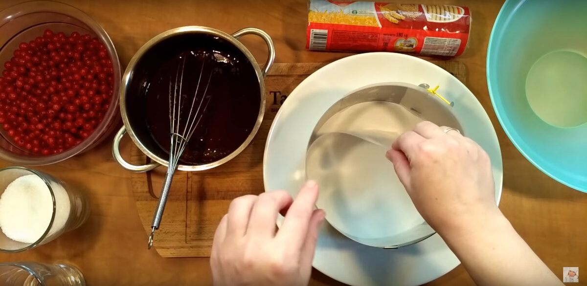 Сегодня готовлю очень красивый, вкусный и нежный торт с красной смородиной и шоколадом. Подготовлю желатин для ягодной прослойки, 10 гр желатина растворяю в холодной воде и отставляю в сторону на время, указанное на упаковке. Сварю шоколадную помадку. В кастрюльку всыпаю 120 гр сахара, вливаю 150 мл воды, добавляю 3 столовых ложки какао-порошка и 8 гр ванильного сахара. Кастрюльку ставлю на огонь, масса должна прокипеть 5-7 минут. Кулинарное кольцо ставлю на тарелку, в которой буду подавать торт. Борта кольца предварительно смазала растительным маслом и проклеила пленкой. Ломаю руками печенье "Мария" на маленькие кусочки. Шоколадка в кастрюльке уже остыла, добавляю ее в печенье по ложке. Перемешиваю. У меня ушла примерно 1/2 шоколадной массы. Перемешиваю. Печенье в шоколаде перекладываю в кольцо и очень плотно утрамбовываю ложкой. Временно отправляю тарелку в морозилку. Приступаю к ягодной прослойке. Всыпаю 400 гр красной смородины в кастрюлю, добавляю 150 гр сахара и 60 мл воды. Ставл