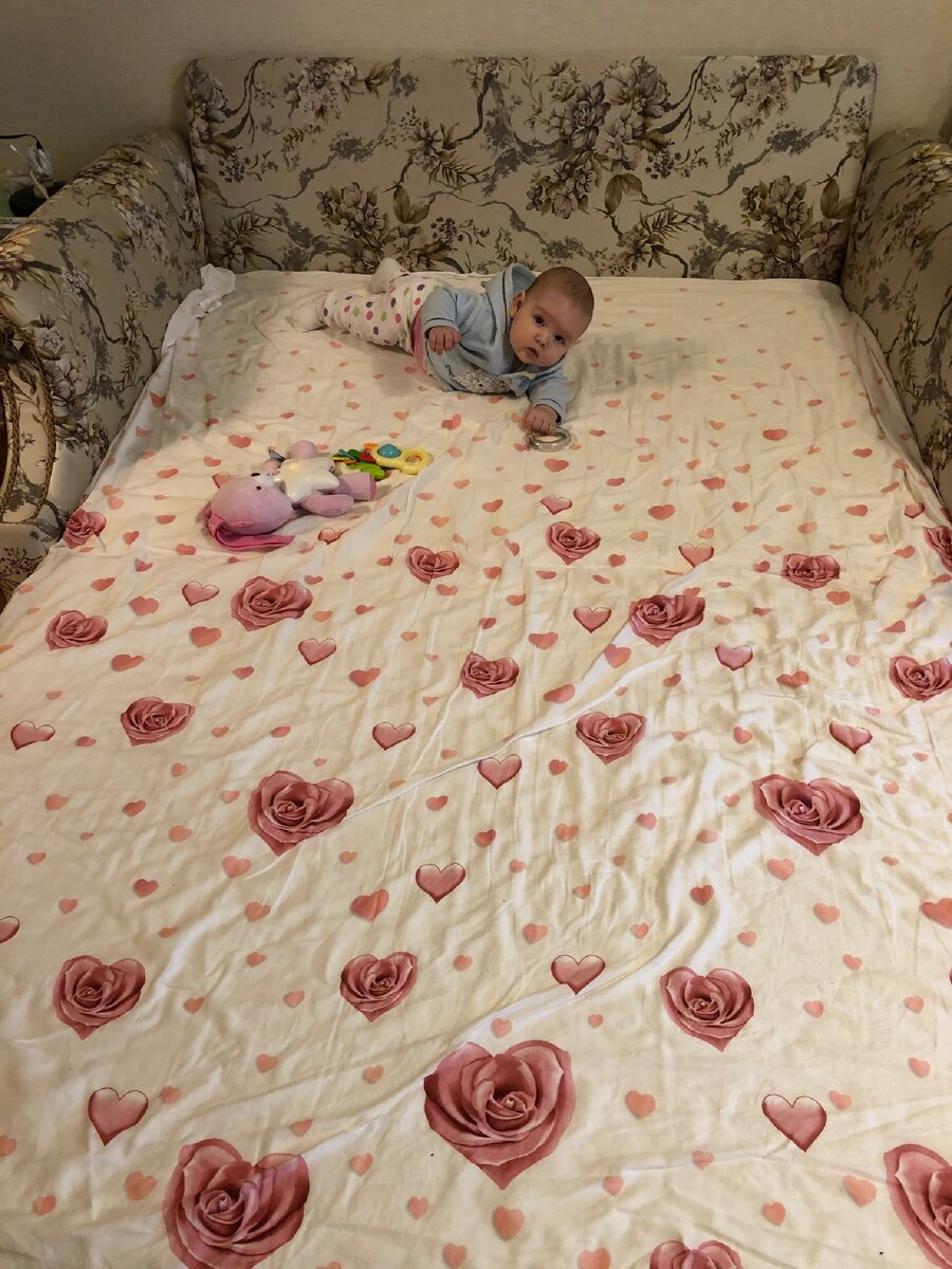 4️⃣ В системе Марии Монтессори, ребёнка уже в два месяца надо спускать на пол. Пусть лежит на животике, смотрится в народное зеркало, учится ползать и кататься. У нас попросту не было возможности держать ребёнка на полу: отсутствие ковра, холодный ламинат, домашние животные и банально даже отсутствие места для ползания. Недавно мы переехали в новую квартиру, где места побольше, и есть ковёр, и теперь дочь с удовольствием на нем играет и катается. Надеюсь, скоро научится ползать (а если бы раньше спускали на пол - раньше бы научилась ползать).