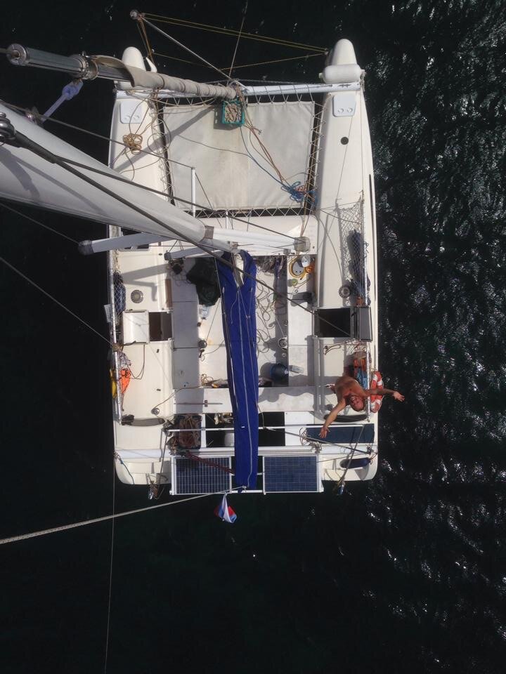 С утра сильно раздуло, мотор едва справляется, встали на якоре не у пляжа, а чуть в стороне. Тут нет волн - Алексею лезть на мачту, ставить на топовый огонь новый колпак.