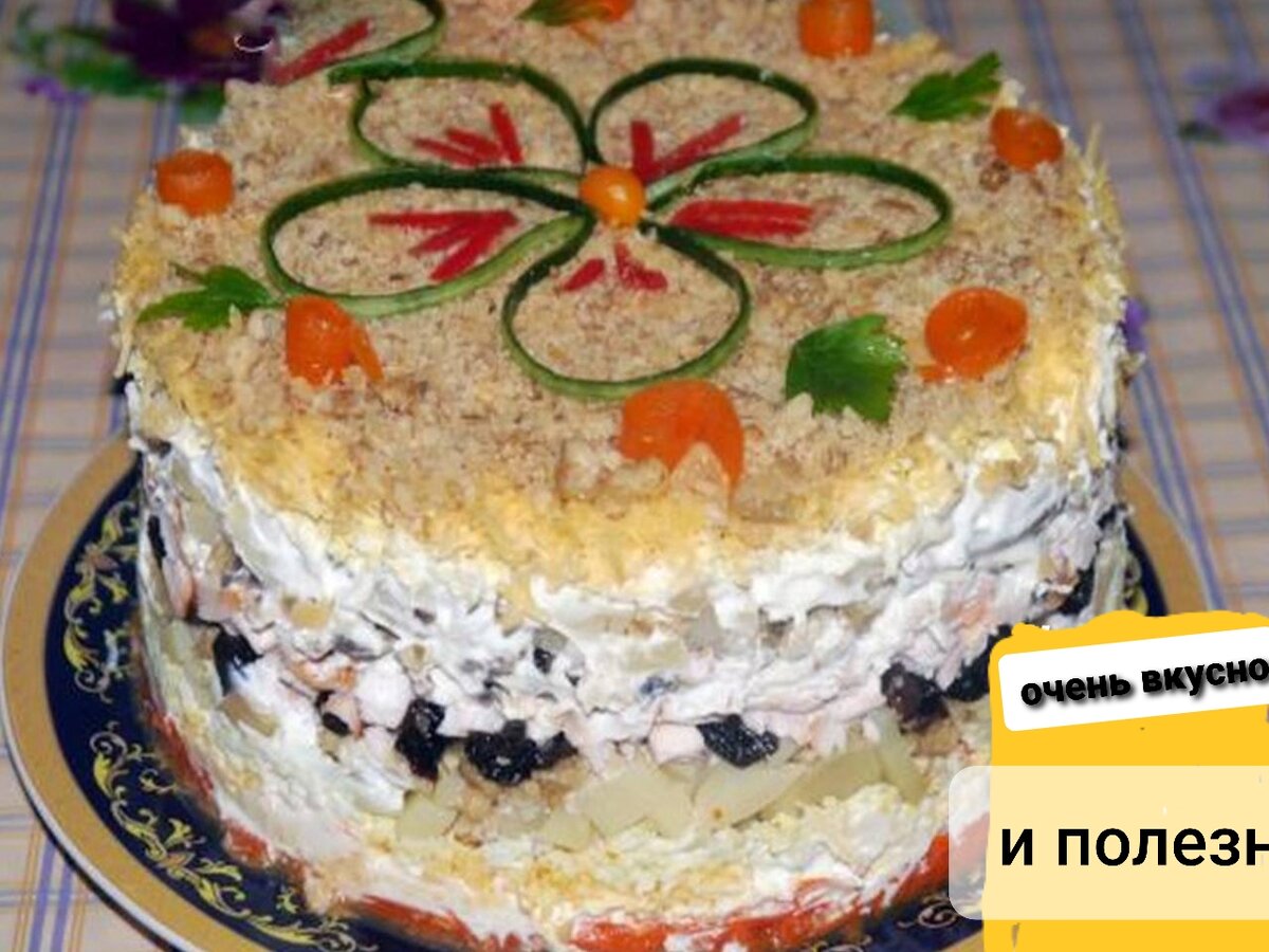 Салат называется "Торжество". К новому году как раз самый раз. Для этого понадобится: Куриная грудка — 200 г Картофель (крупный) — 1 шт. Огурец соленый — 1шт. Яйца — 2 шт. Чернослив — 100 г Майонез — 2 ст. л. Приготовление: 1. Подготовьте все необходимые ингредиенты. Картофель отварите до готовности, охладите и очистите. Яйца отварите вкрутую. Куриную грудку отварите в слегка подсоленной воде до готовности. 2. Картофель натрите на крупной терке, куриную грудку мелко порежьте ножом. 3. Яйца разделите на белки и желтки, белки натрите на мелкой терке, желтки измельчите вилкой. Огурец мелко порежьте или натрите на крупной терке. 4. Чернослив залейте кипятком на 10 минут, затем воду слейте, а чернослив мелко нарежьте. 5. На плоскую тарелку установите сервировочное кольцо. На дно выложите картофель и смажьте майонезом. 6. Выложите измельченный соленый огурец. Толщину слоя регулируйте по своему вкусу. Сверху смажьте майонезом. 7. Сверху выложите куриную грудку. Сверху - сеточка м