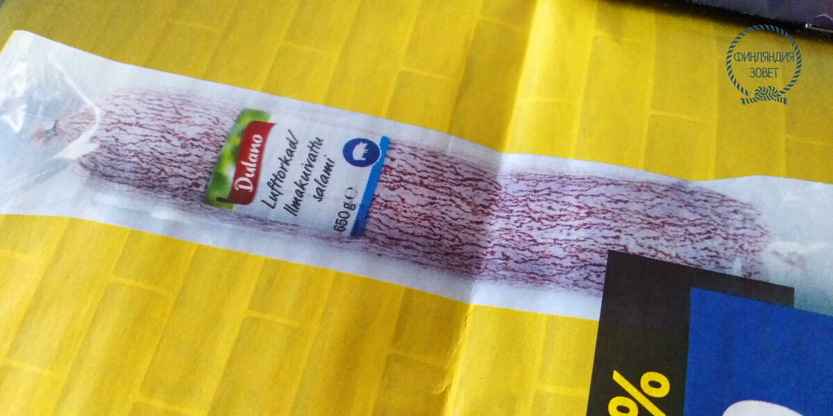 Кстати, соврала реклама-то! Нет, деньги те же, скидка действует, все по-честному. Но на картинке в рекламе одна колбаса, а на деле другая )) Но вы знаете, разбирают жители Финляндии эти батоны. Мы сходили в магазин, заметили — да, лежит, родная. Причем, в коробке осталось всего четыре палки. Мы брать не стали. Во-первых, я не люблю колбасу с паприкой. Во-вторых, я не люблю покупать огромную упаковку. Это означает, что каждый день у тебя будет одна и та же колбаса. А так ведь неинтересно, вкус наскучит быстро. Лучше покупать по крошечным упаковкам, зато часто и разную. Хотя это и дороже, конечно.