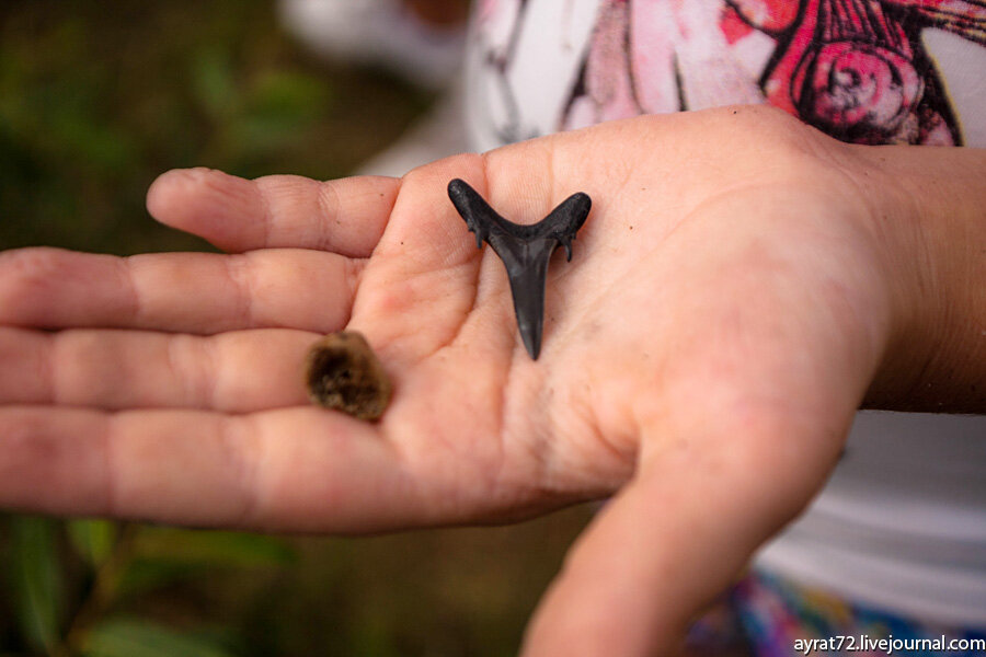 Возраст таких находок может измеряться в сотнях тысяч, а то и миллионах лет! А в этом ручейке зубов можно насобирать горсть, тюменские палеонтологи-любители даже прозвали место - "Акулий пляж". Кстати, пляж присутствует на самом деле. Только он не природный, а образовался в результате деятельности искателей древних артефактов. Берега на самом деле илистые, а мелкую приятную гальку намывают со дна ручья, просеивают через дуршлаг, зубы акул, если попадутся, забирают, а гальку высыпают на берегу. Летом речка Дерней представляет из себя ручеек, который можно легко перепрыгнуть. Тот случай, когда размер не важен. Зубы, кстати, это единственное, что остается от акулы. Но остается зубов много. Акулам можно позавидовать в части зубов: вместо потерянного новый зуб вырастает почти мгновенно и процесс этот бесконечен. Очередная находка - фрагмент небольшой челюсти. Вроде бы древнего ската. Не запомнил, если честно. Знатоки, пишите в комментариях, если что. С нами в мини-экспедиции было много р