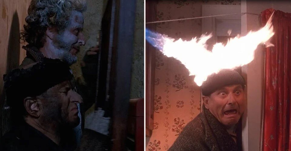 Несколько падений? Есть. Врезаться в кирпичную стену? Есть. Когда бандиты пытались перебраться с помощью каната из окна в домик Кевина на дереве, Марв пошутил, что можно покончить с собой, если выпрыгнуть из него.