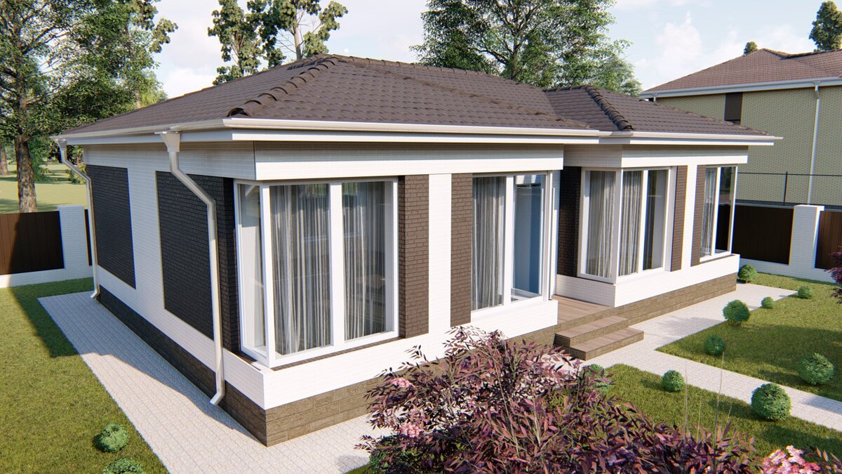 Дом, который рассмотрим сегодня, достаточно невелик, площадь застройки всего 101 м2, что позволяет говорить о стоимости строительства в базовой комплектации (без учёта отделки) от 1.350.000 руб. Согласитесь, немного? В то же время, дом ориентирован на комфортное проживание проживание небольшой семьи из 2-3 человек - пожилая семейная пара, семья с ребёнком. Исходя из этого в доме 2 удобных спальни. А вот кухня-гостиная очень большая (46 м2) - размеры вполне позволяют в зоне гостиной организовать настоящий домашний кинотеатр. Фасадная отделка и дизайн остекления с красивыми угловыми витражными окнами также говорят о том, что дом будет правильно отнести к категории комфорт-класса недвижимости. Проект может также реализовываться не как основной дом для проживания семьи заказчика, а как гостевой дом в составе благоустроенной усадьбы. Думаю, преимущества практичных одноэтажных домов достаточно очевидны. Особенно хорошо стоит продумать вопрос строительства если в доме будут жить пожилые лю