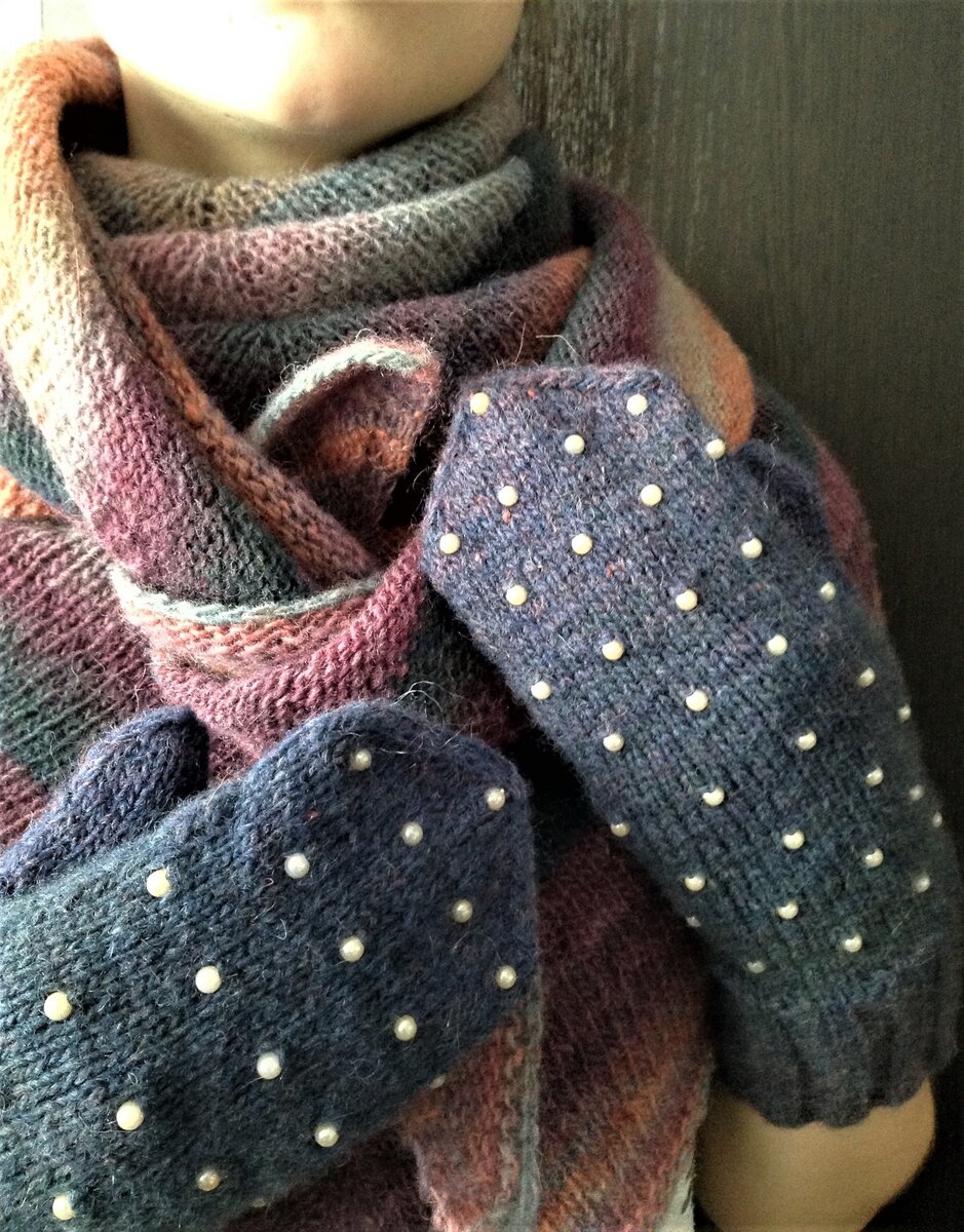 Комплект состоит из треугольного платка и варежек. Вязала из дундаги 1/6 (500м в 100г), 1 пасма, спицы №3,5, для платка "круговые", для варежек "гибкие" (3 спицы). Плотность 18п.х24р. Бусинок 68 шт., крючок 0,60 - самый тонкий. Платок - треугольный с центральной линией, по описанию "Аграфена". Длина в основании от угла до угла - 180 см; высота по центральной линии - 80 см - 85 прибавлений. Лицевая гладь. Варежки с бусинками. Длина - 23 см; ширина - 9см. Набираем 40 п., вяжем резинкой 2х2 15 рядов и 3 ряда лицевыми петлями. Начинаем вязать узор с бусинками, смотрите схему (листайте галерею). Как вязать с бусинами смотрите видео. Бусины только на внешней стороне, на ладони их нет. В 21-м ряду оставляем отверстия для пальцев; для правой варежки справа, для левой - слева. Для этого 9 п. снимаем на булавку, а в следующем ряду 9 п. набираем. Продолжаем вязать по схеме, с 40-го ряда и начинаем делать убавления в каждом ряду, провязывая по 2 п. вместе с правой стороны с наклоном влево, с лево