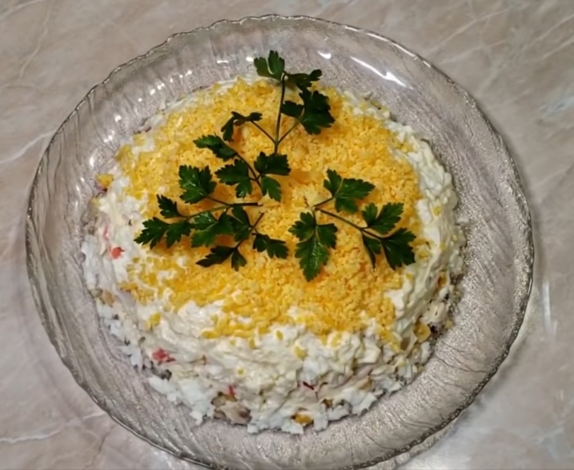 Ингредиенты : Для приготовления нам понадобится : 1. Любые рыбные консервы - 1 банка. 2. Крабовые палочки - 6 штук. 3. Кукуруза консервированная - пол банки. 4. Плавленый сырок - 1 штука. 5. Яйца - 4 штуки. 6. Лук репчатый - 1 небольшая. 7. Майонез - 250гр. Способ приготовления : 1. Выкладываем салат слоями. Разминаем консервы, выкладываем первым слоем в салатник, лук порезать мелко и посыпать сверху консервов, промазать майонезом. 2. Второй слой идёт плавленый сырок, натереть на тёрке, сверху посыпать кукурузой и промазать майонезом. 3. Следующий слой идут крабовые палочки, их нарезать кубиками и выложить в салатник. Промазать майонезом. 4. Белки отделить от желтка и размять вилкой, выложить в салатник. Промазать майонезом. 5. Желтки трём на мелкой тёрке и украшаем верх нашего салата. Приятного аппетита!!! Если Вам понравился рецепт - поставьте Класс или поделитесь в соцсетях. Мне будет очень приятно! Подписывайтесь на мой канал и узнаете много вкусных, простых и интересн