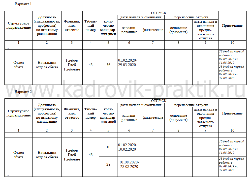 Как правильно отразить в графике отпусков на будущий год неотгулянные своевременно ежегодные отпуска за прошлые периоды? Они отражаются в обычном порядке, но в графе «Примечания» рекомендуется обозначит за какой период какие дни отпуска предоставляются. Приведем примеры. График отпусков (включение отпусков за прошлые периоды в график, фрагмент). Образцы Примечание Приведен образец формы графика, разработанного на основании унифицированной формы N Т-7 с некоторыми корректировками, в частности, с уточнением «шапки» граф 6 и 7 - «даты начала и окончания отпуска». Напомним, что... читать далее >> Рекомендуем: