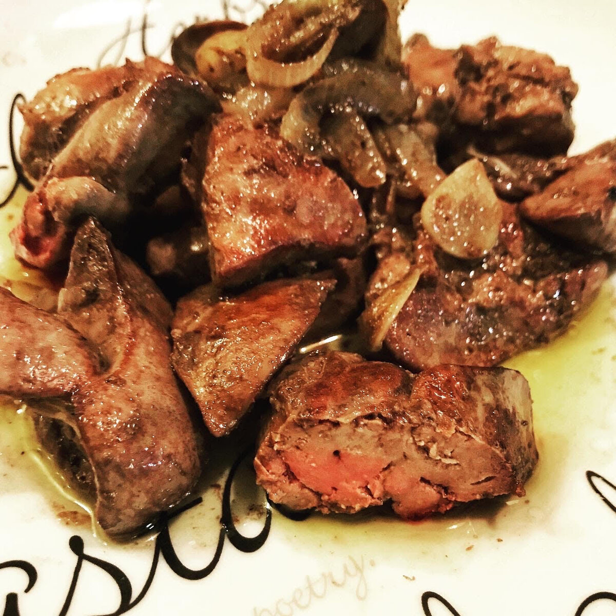 Куриная печенка – это пища богов! Нежная, как суфле, тающая во рту, ароматная, сочная! Раньше я терпеть ее не могла, потому что не умела готовить, точнее готовила слишком долго. Получалась сухая, как песок, рыхлая и безвкусная гадость. А на самом деле все так просто! Режете печенку на две части. Репчатый лук нарезаете полукольцами, а чеснок - мелко. Хорошо разогреваете сковороду с толстым дном и наливаете на нее оливковое масло. Выкладываете печенку и лук, жарите около минуты с одной стороны (пока не появится золотистая корочка). Аккуратненько переворачиваете и жарите еще минутку. Добавляете чеснок и все вместе готовите еще минуту, помешивая. Все! Чтобы проверить готовность, разрежьте печенку посерединке: она должна быть слегка розоватая, но без крови. Можете еще посыпать мелко нарезанной кинзой. Ешьте с наслаждением! И вы - мой личный враг, если не согласитесь, что куриная печенка - это пища богов!