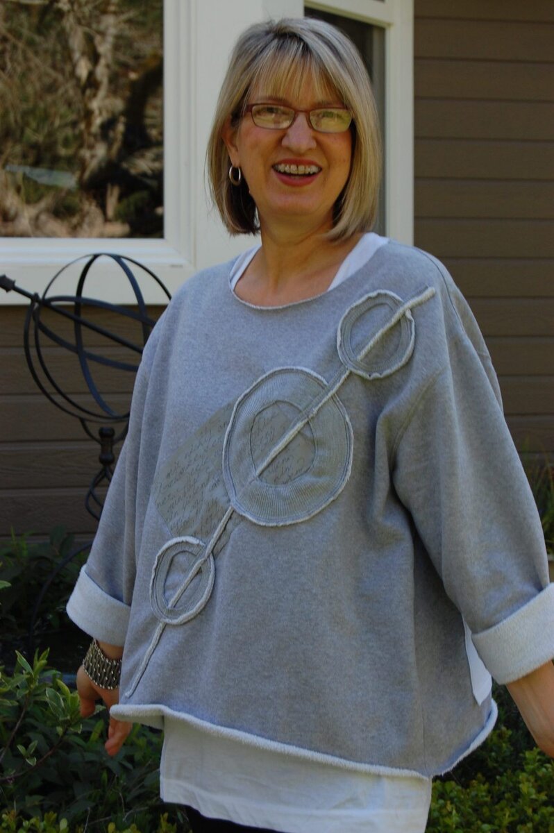 Если у вас набралось несколько трикотажных вещей для переделки, вам под силу создать уникальную тунику на праздники. Встретим Новый год в красивой оригинальной вещи! Подруги оценят))) Первое важное- выстирать и отпарить все, что готово к «растерзанию». второе- подготовьте заранее рисунок на обычной бумаге и перенесите иголками на ту часть, на которой будет аппликация, вышивка или рисунок… Я понимаю, что вы не кутюрье типа Шанель или Лагерфельда. Но каждая россиянка даст пару сотен очков большинству женщин мира, которые не держали в руках иголку и спицы. Главное- не переборщить. Не надо в одной вещи сразу пытаться собрать аппликацию, вышивку и рисунок, если вы новичок в шитье и переделке. Выберите самое простое- рисунок с аппликацией. Подложив плотную бумагу под ткань, нарисуйте цветок, солнышко или рыбу на передней полочке и дайте просохнуть, затем под бумагой прогладьте утюгом рисунок и вышейте на нем пару цветочков, крестиков или нашейте смешные лоскуты. Кстати, об очень простой и