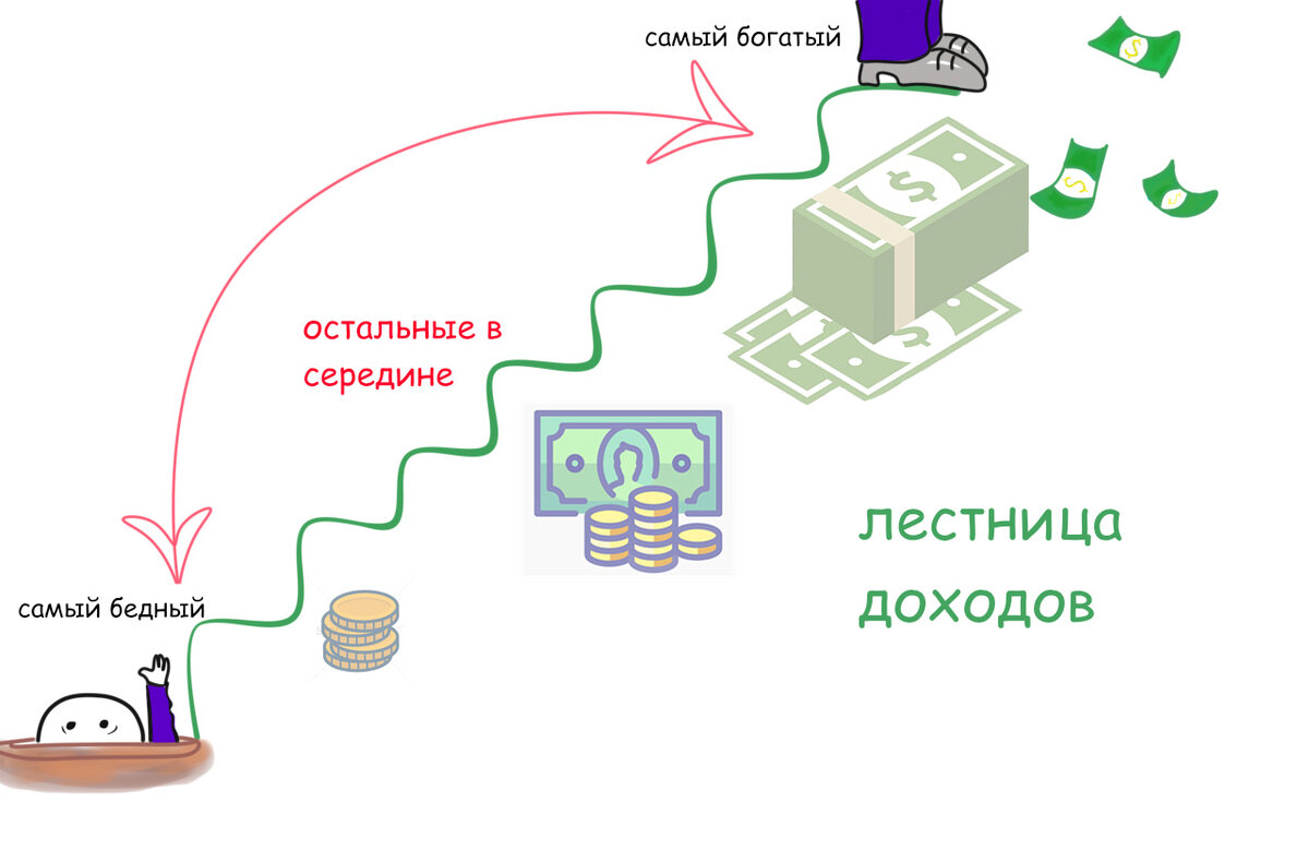 А есть ли равенство? Итак, сначала посмотрим на реальную статистику. Около 14% россиян в 2019 проживают за чертой бедности, это те люди, доход которых меньше прожиточного минимума. У простого человека возникает логичный вопрос: "Процент людей можно смело задвинуть за черту бедности (полный жизненный аут когда денег по факту нет совсем). А как же живут остальные люди? Каков процент по-настоящему богатых, и сколько “середнячков” в нашей стране?" Для наглядности создадим денежную лестницу и распределим массу людей по уровню их доходов. Наша лесенка спета На самой высокой ступеньке будут находиться, конечно же, богатые. Соответственно, бедным самое место внизу. У каждой лестницы, как и у всех нас, есть начало и конец. Мы выделим на этой лестнице только богача и “того Петю без денег”, который живет хуже всех. Ты спросишь: "И кто же тот самый богач, который стоит на вершине, глядя свысока на остальных и злобно посмеиваясь над их пустыми кошельками?" (образно) Для того, чтобы ответить на