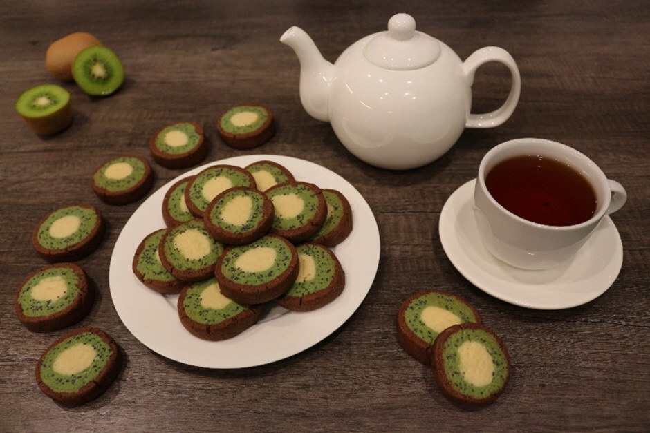 Печенье "Киви" Ингредиенты: сахарная пудра (сахарная) - 120 г яйца куриные - 1 шт. мука - 350 г какао (порошок) - 2 ч.л. мак - 1 ч.л. пищевой краситель (зеленый) - 2 г цедра лимона - 1 ч.л. масло сливочное - 180 г Процесс приготовления: 1. Из холодильника заранее достать сливочное масло, чтобы оно стало мягким. Когда масло будет размягченным, выложить его в глубокую емкость и взбить его с сахарной пудрой до однородной консистенции. 2. Затем к смеси масла и сахарной пудры вбить яйцо и в глубокой емкости взбить миксером. 3. Добавить муку, просеянную через сито и цедру лимона. Замесить тесто. По консистенции оно будет мягким и эластичным, не будет липнуть к рукам. 4. Тесто разделить на 3 части: первая самая большая, вторая немного меньше, третья гораздо меньше второй. В самый большую часть теста добавить зеленый краситель, размять руками до однородного цвета. Во вторую часть ничего не добавлять. В третью добавить какао-порошок. Хорошо размять руками. Убрать все кусочки теста в моро