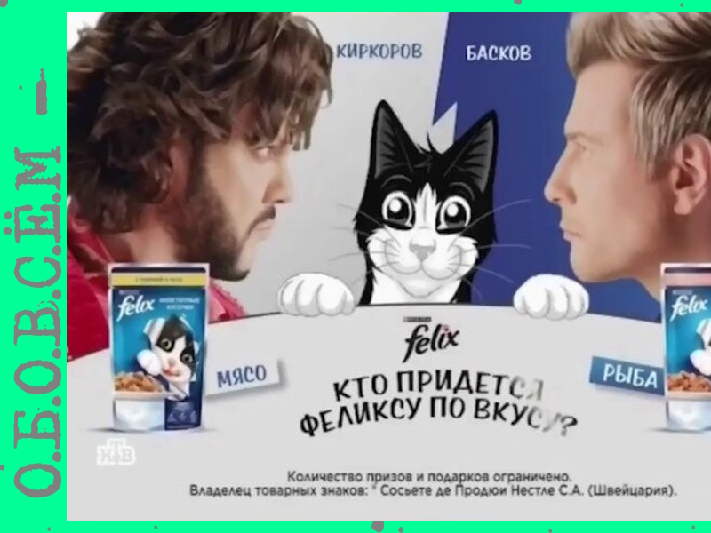 Если, кто не догадался, то - поясню: речь пойдёт о рекламе по любимому нашему ТВ-ящику. Статьи о рекламе, полагаю, уже - навязли в зубах, но иногда трудно не удержаться, что бы на эти "произведения телевизионного искусства" не вылить своё ведро помоев. На первом месте, конечно же два самых известных наших "телепузика"! Но сразу хочу сказать: Это - не реклама кошачьего корма, как вы могли подумать... На корм, этим двум персонажам - плевать, иначе бы они заметили, что поют про мясо, а рекламируют индейку. Но это - лирика. На самом деле, это - не реклама корма, а реклама двух этих (как бы мягче выразиться?)... артистов. Октябрь-ноябрь - время усиленных предновогодних "чёсов" нашей попсы, по городам и весям всей необъятной Родины. И чем больше ты мелькаешь перед взором народа, тем лучшей рекламой твоих концертов это становиться! А тут - все довольны! И кошки сыты и "чёсы" целы! Гениальная идея! "Кто придётся Феликсу по вкусу?"... Если бы этот Феликс выступал в цирке братьев Запашных, ему