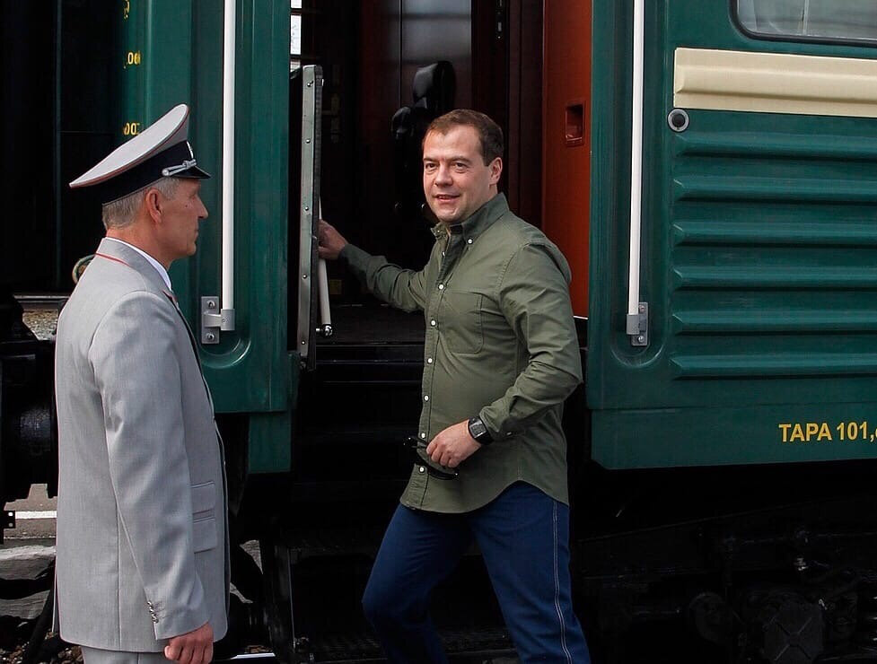 Несмотря на то, что Путин и Медведев ездят на поезде крайне редко, было решено создать для них отдельный так называемый спецпоезд, в котором 9 вагонов. Подробнее о том, в каком стиле был выполнен поезд и зачем это было надо, мы расскажем в нашей сегодняшней статье. Недавно в СМИ просочилась новость о поездке Дмитрия Медведева на спецпоезде, который был создан специально для него и президента Владимира Путина. Так что же из себя представляет этот поезд? В первом вагоне - спецсвязь, там никто не ездит. Во втором вагоне размещаются работники РЖД, в третьем - сотрудники Федеральной службы охраны. Примечательно, что все они вполне обычные, а вот четвертый вагон, принадлежащий Медведеву, отличается от них. В этом вагоне есть кровать, кухня, туалет и даже место, где премьер-министр может спокойно работать. Там располагается письменный стол, а также стол на 6 человек и телевизор - для совещаний. Этот вагон выполнен в коричнево-бежевом цвете. К счастью, обошлись без золотых ручек и прочей рос