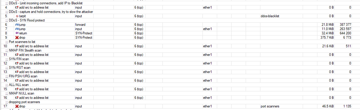 - add action=jump chain=input connection-state=new in-interface=ether1 \ jump-target=SYN-Protect protocol=tcp tcp-flags=syn