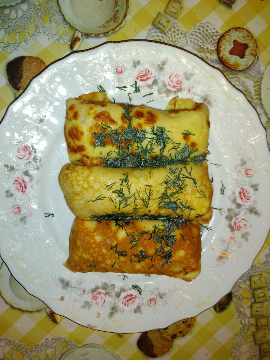 Ингредиенты: молоко 400 мл, яйца 3 шт, сахар 1 ст л, соль 1/2 ч л, масло растительное 2 ст л, мука 1,5-2 стакана, сыр, колбаса. В миску добавляем все ингредиенты, добавляем муку и смешиваем до однородного состояния. Обжариваем с двух сторон. Натираем на терке сыр и колбасу. Берем блинчик и выкладываем на него начинку и заворачиваем. Приятного аппетита!