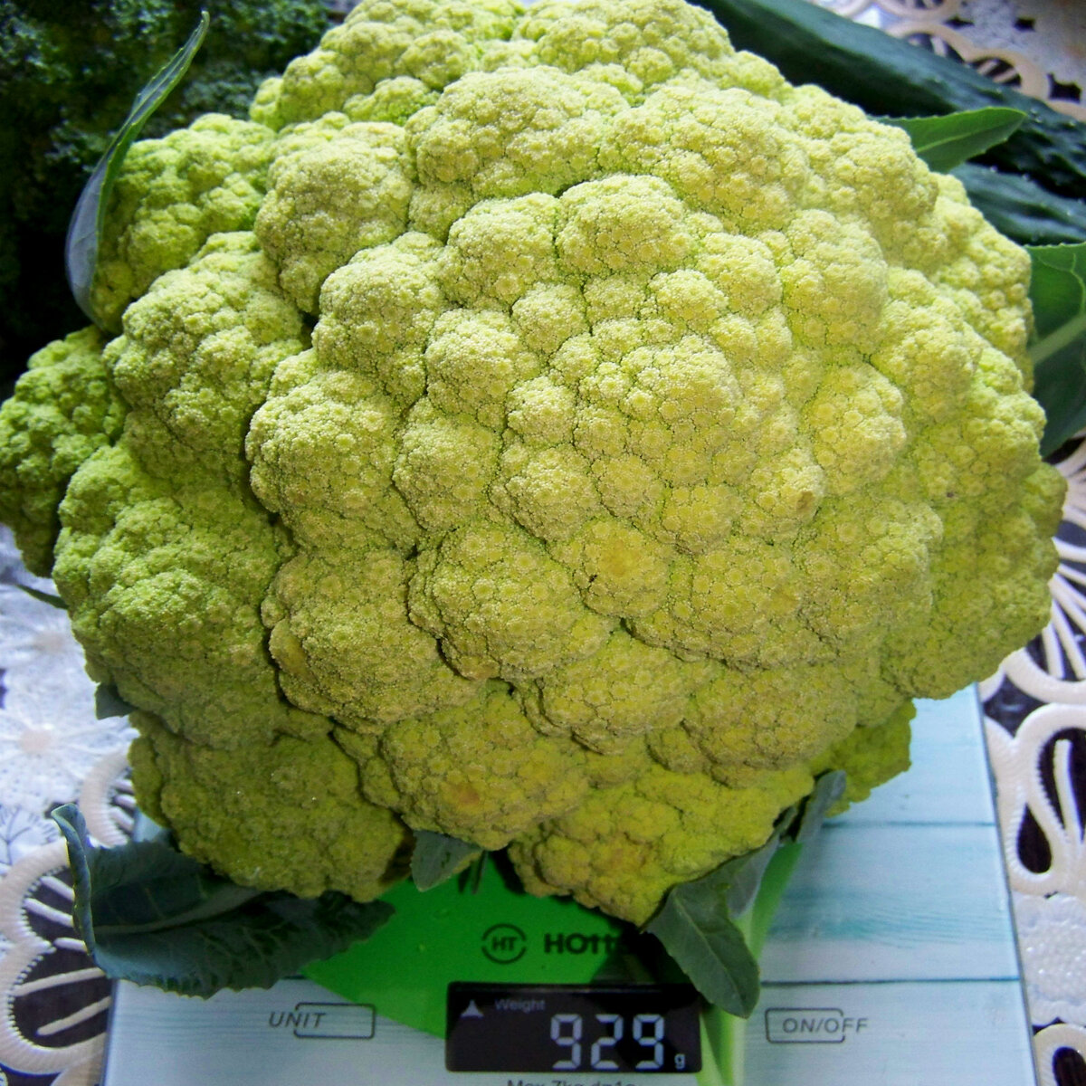 Этот гибрид цветной капусты выращивала в прошлом сезоне впервые. Я вообще, люблю овощи с плодами необычной окраски. Вот и у этого гибрида цветочная головка нежно-салатового цвета. Как известно, при бланшировке и варке обычной цветной капусты приходится добавлять лимонную кислоту, чтобы сохранить белоснежный вид. Салатовая капуста же не только не теряет цвет, наоборот, при тепловой обработке становится только ярче и привлекательнее. Она необыкновенно хороша в супах и гарнирах. Так выглядит бланшированная цветная капуста Гибрид Витаверде создан компанией Rijk Zwaan. Отличается высокой урожайностью. Цветочные головки достигают 900-1300 г, а два растения у меня вообще потянули на 1480 и 1560 г. Вообще, головка плотная, на солнце не темнеет, потому что листья ее плотно обхватывают. Капуста эта ранняя, высаживала 25-ти дневной рассадой и уже через 1,5 месяца получила урожай. В целом же не доставила особых хлопот: была посажена на приподнятую грядку с рыхлой плодородной почвой, заправл