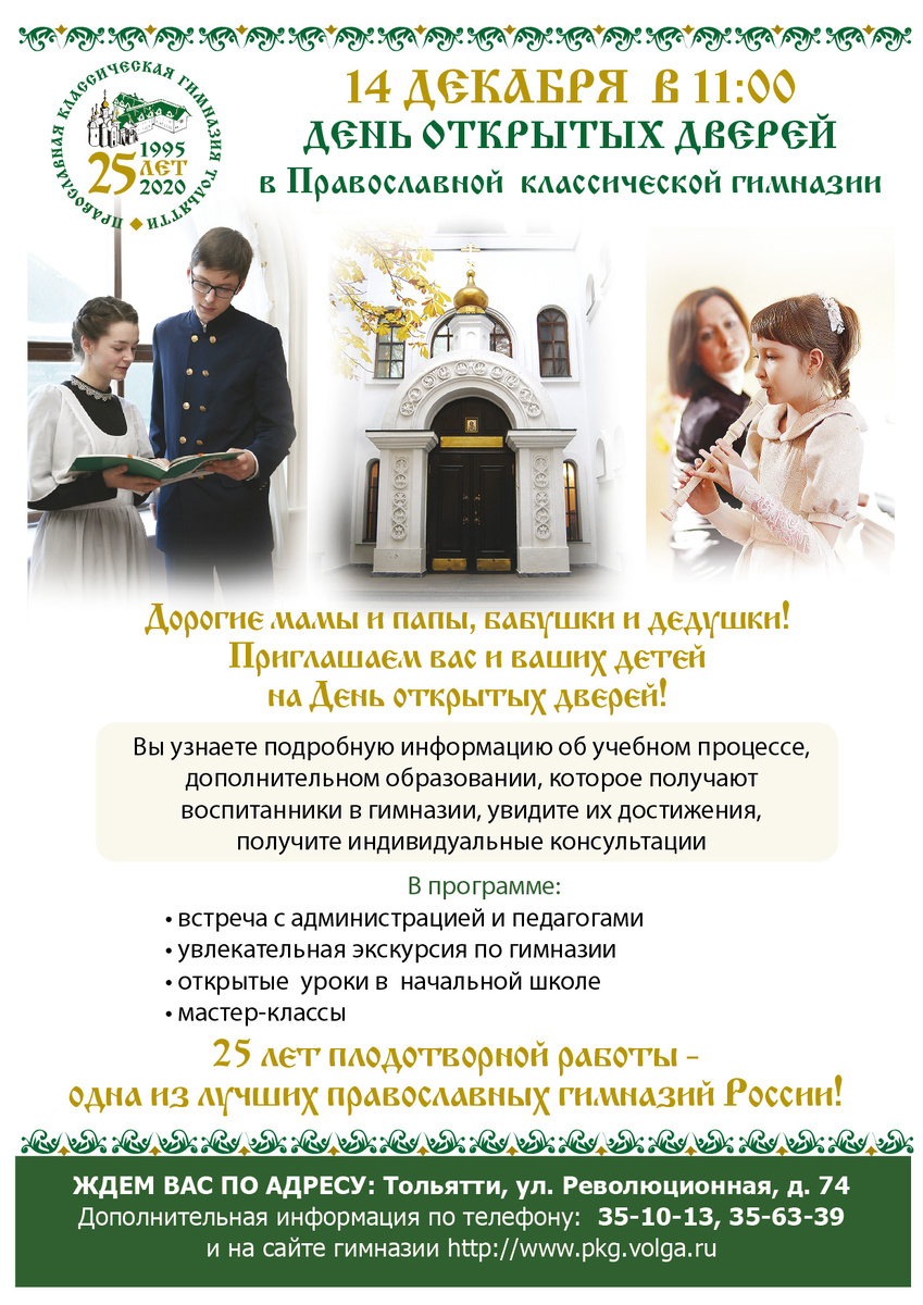 Дорогие друзья! 14 декабря 2019 года в 11:00 приглашаем вас и ваших детей на День открытых дверей в Православную классическую гимназию. Православная классическая гимназия – одна из лучших гимназий России. Вы узнаете подробно об учебном процессе, дополнительном образовании, которое получают воспитанники гимназии, увидите их достижения, получите консультации. В программе: увлекательные экскурсии по гимназии, открытые уроки в начальной школе, мастер-классы, встреча с администрацией и педагогами гимназии. Православная классическая гимназия – 25 лет успешной и плодотворной работы! В 1995 году в Тольятти открыла свои двери для детей, чьи родители думали не только о знаниях, но и о душах своих чад, Православная классическая гимназия — единственное учебное заведение по всей Самарской области, где гармонично сочеталось просвещение ума и духовное воспитание в традициях русской православной культуры. Стоит отметить, что Православная классическая гимназия даёт учащимся уникальное