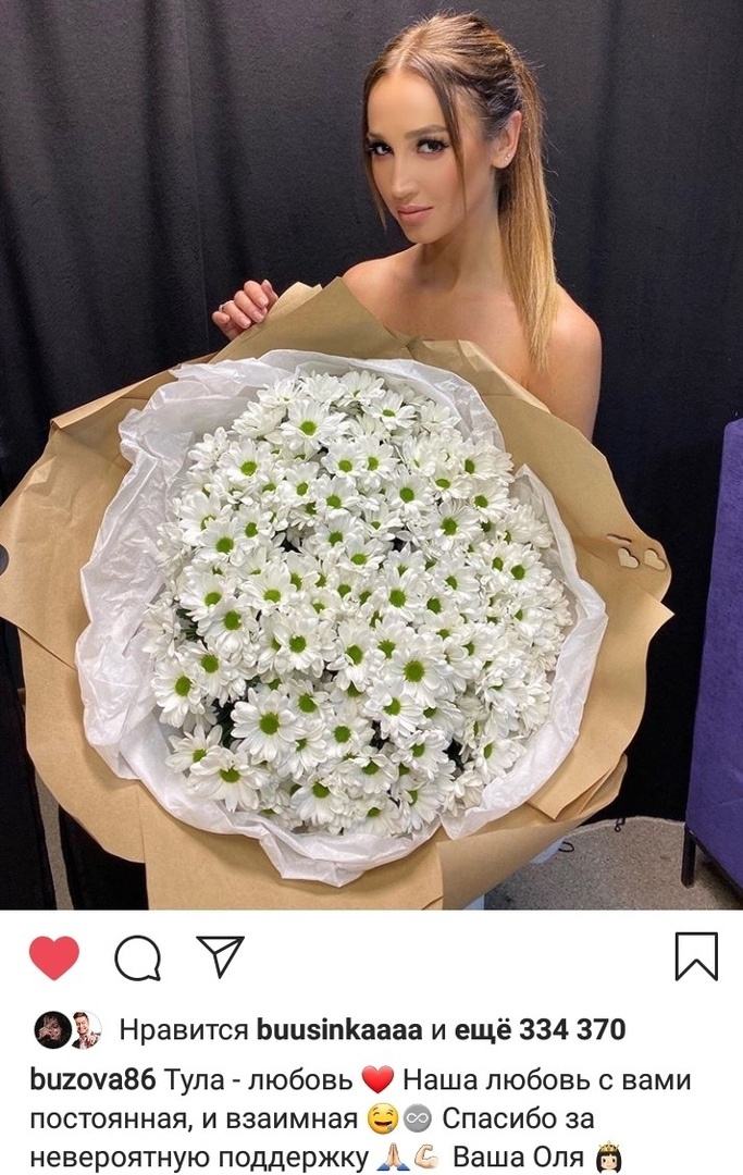 30 ноября прошел сольный концерт певицы в оружейной столице. После выступления Ольга Бузова призналась Туле в своей любви открытым способом, в прямом его понимании. Певица выложила в свой Instagram достаточно интересную фотографию: Ольга «открыла» свой верх, а тело прикрыла огромным букетом ромашек, после чего написала: «Тула — любовь. Наша любовь с вами постоянная, и взаимная. Спасибо за невероятную поддержку. Ваша Оля», — так гласит пост Ольги Бузовой в своём Instagram-аккаунте.