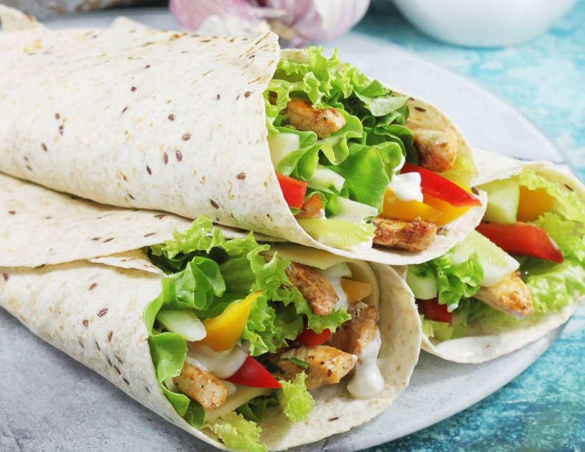 Вкусная, красочная куриная тортилья, рецепт которой невероятно прост, отличная альтернатива бутербродам. Возьмите с собой в дорогу, перекусывайте дома, угощайте друзей! Ингредиенты 4 пшеничные лепешки 400-500 гр. филе курицы 20-30 мл оливкового масла По щепотке паприки, перца чили и черного молотого перца 20 листьев салата 1 красный сладкий перец 8 пластин сыра 200-300 гр. огурца (свежего) Соус 50 мл классического йогурта 30 гр. майонеза 1-2 зубчика чеснока 10 мл лимонного сока По щепотке соли и черного перца Приготовление Филе промоем, обсушим, нарежем тонкими полосками, посыплем солью, специями, оставим на 30-40 минут (если замариновать на ночь, будет еще вкуснее), затем обжарим на растительном масле. Готовим на среднем огне, чтобы кусочки зарумянились сверху, но остались сочными внутри. Приготовим соус: смешаем йогурт, майонез, соль, выжатый через пресс чеснок и специи, по желанию можно добавить любимую зелень. Нарежем полосками огурец и сладкий перец, листья салата тщательно про