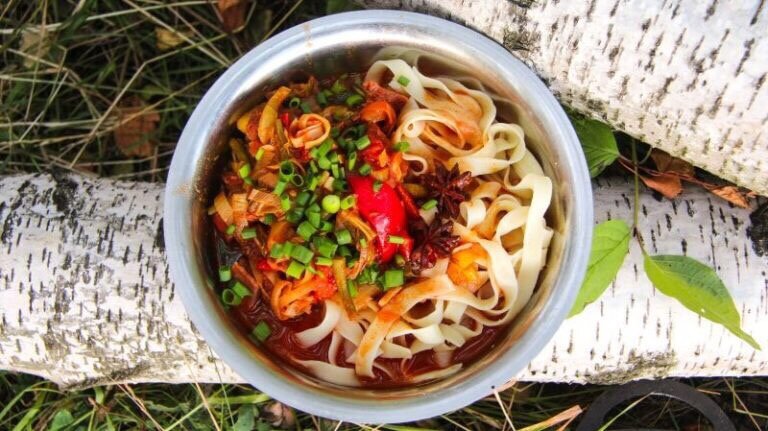 Удон — один из видов пшеничной лапши с мясом, в нашем случае с говядиной и овощами. Это азиатское блюдо и правильно его готовить в вок (wok) сковороде. Также его можно приготовить и на обычной сковороде, но используя вок, вы более правильным образом обжарите все ингредиенты. Также с помощью вок сковороды можно упростить процесс приготовления, к примеру, в нем же отварить лапшу. Это достаточно удобно если вы готовите где-то на костре и у вас нет лишней посуды что бы отварить лапшу.